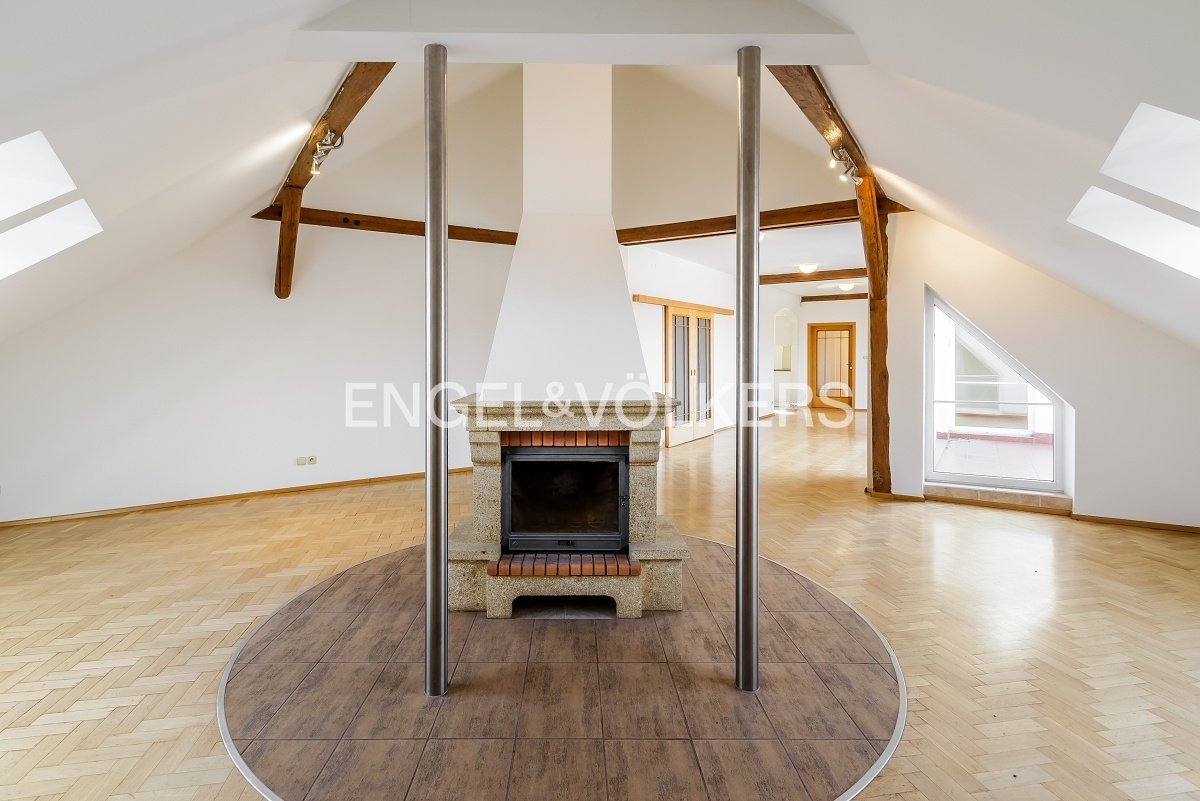 The apartment has a 14 m² east-facing terrace and a 6 m² balcony, which provide a pleasant space for relaxation and seating with a view of the city. The interior includes large bedrooms, a huge dining room, two bathrooms, and a fireplace that adds a cosy atmosphere to the space.