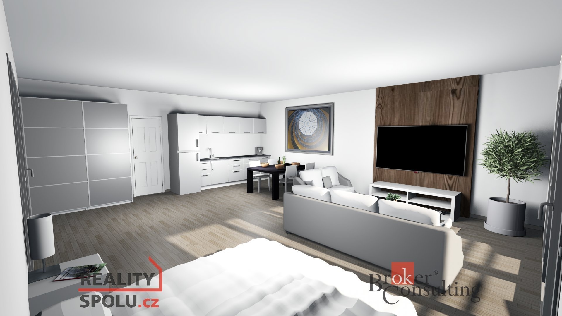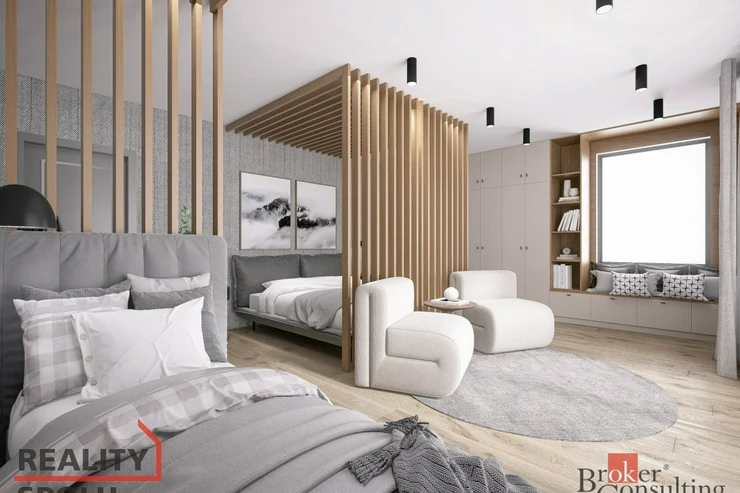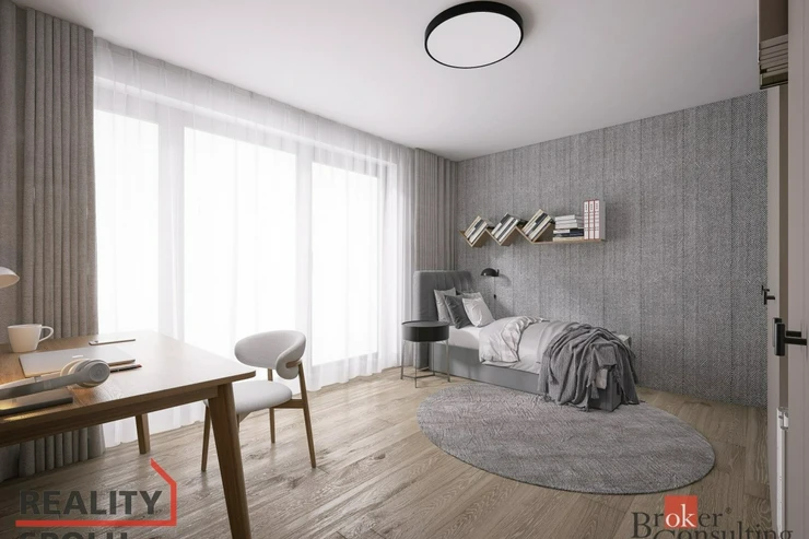 Součástí apartmánu je komfortní samostatná ložnice, která poskytuje dostatek místa pro manželskou postel, úložné prostory a klidné zázemí pro odpočinek. Dominantou je rozlehlý obývací pokoj s kuchyňským koutem, prosvětlený velkoformátovými prosklenými okny. Ty propojují interiér s exteriérem a poskytují výhled na parkoviště a okolní zázemí.