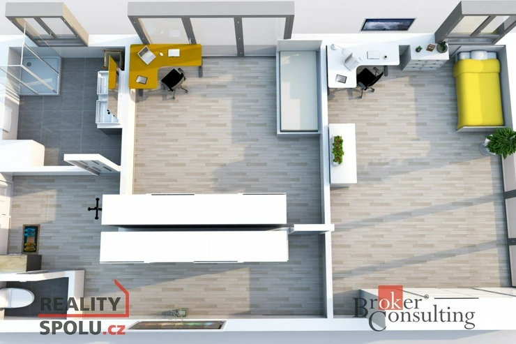 Obývací část nabízí prostor pro pohodlnou sedací soupravu, jídelní kout i kuchyňskou linku dle vlastních představ. Koupelna je navržena v kompletním standardu – se sprchovým koutem, umyvadlem a toaletou.
