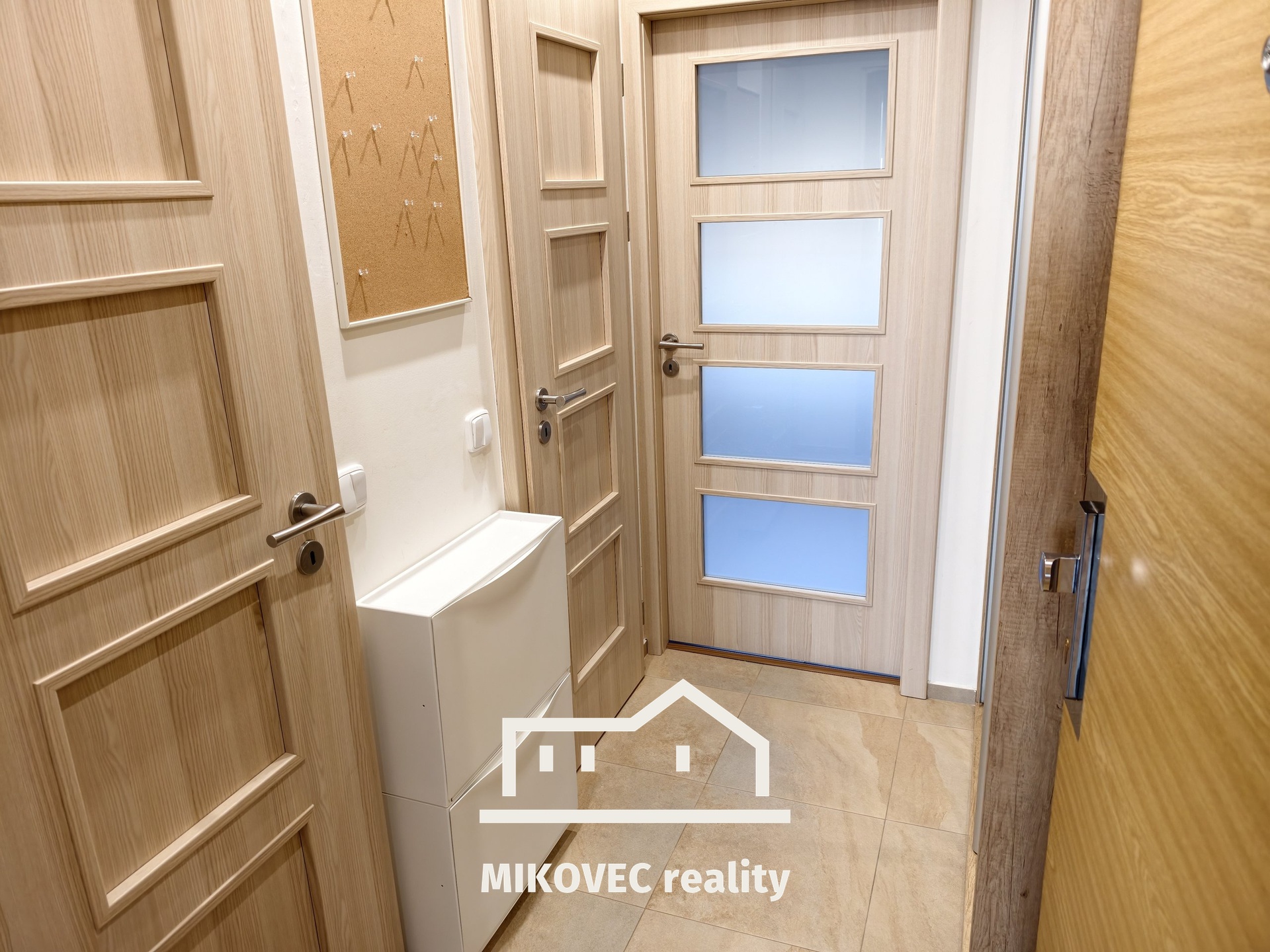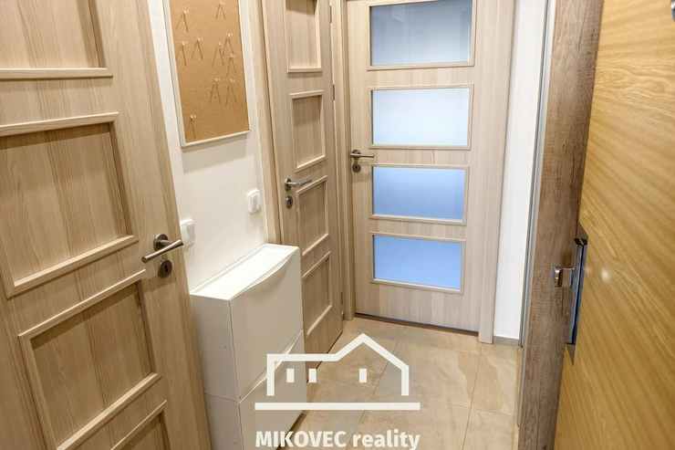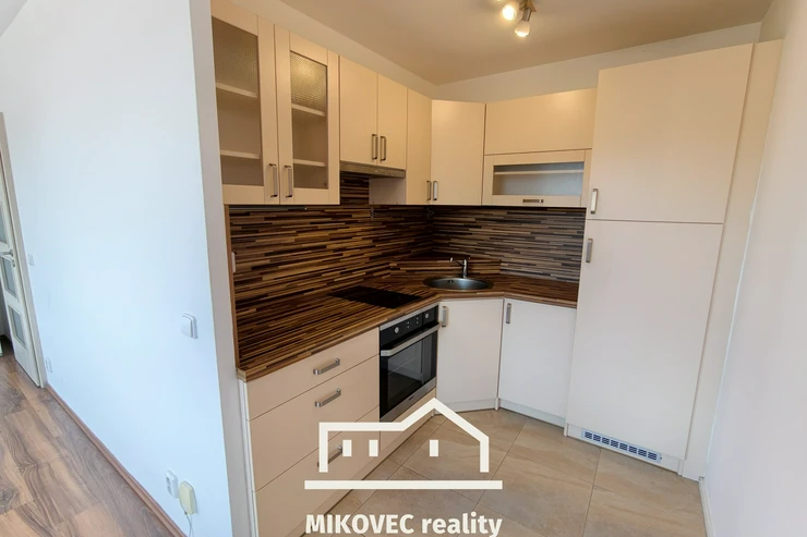 Dispozice bytu je praktická a promyšlená. Ve vstupní chodbě je zhotoveno zádveří na míru s vestavěnou šatní skříní, další velká posuvná skříň je umístěna v pokoji a nabízí dostatek úložného prostoru. Kuchyňský kout je vybaven dvěma indukčními vařiči, digestoří, elektrickou troubou, myčkou i lednicí, takže nový majitel ocení, že byt je připraven k pohodlnému každodennímu užívání.