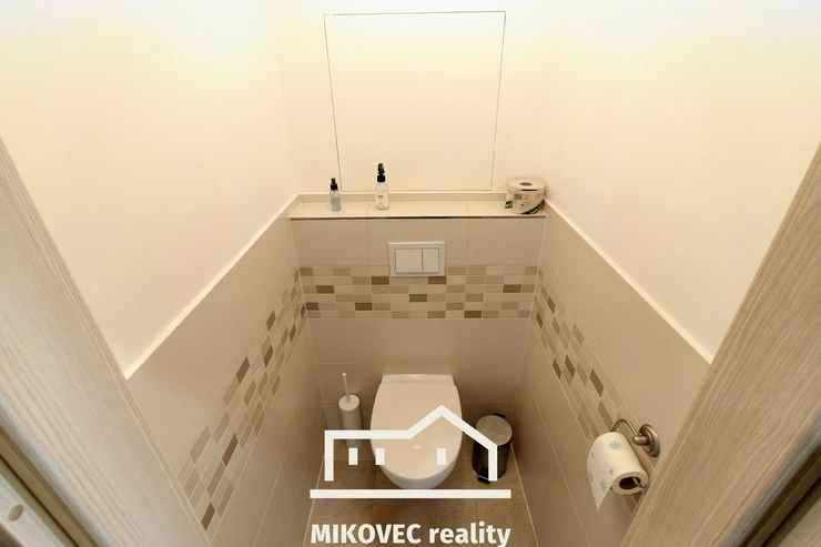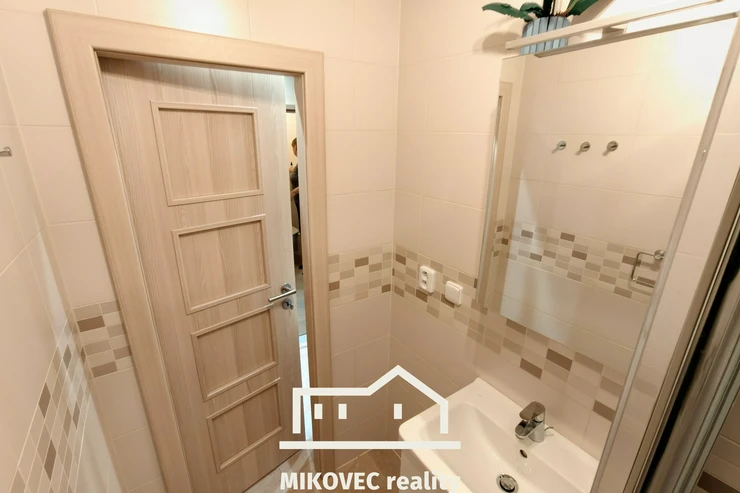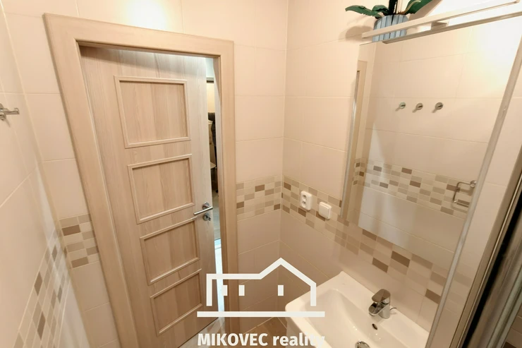 Koupelna nabízí prostorný sprchový kout, umyvadlo a místo pro užší pračku. Toaleta je samostatná. Výhodou je také zděné jádro koupelny i WC, které přispívá k celkově kvalitnímu dojmu z provedené rekonstrukce.