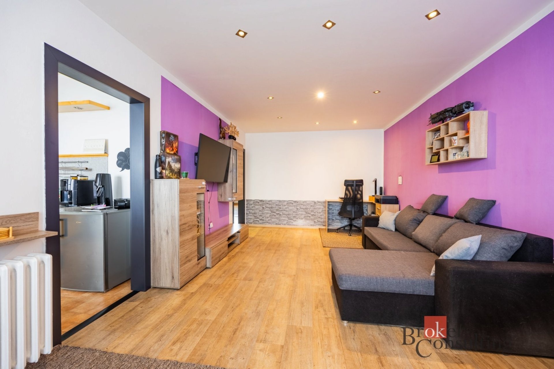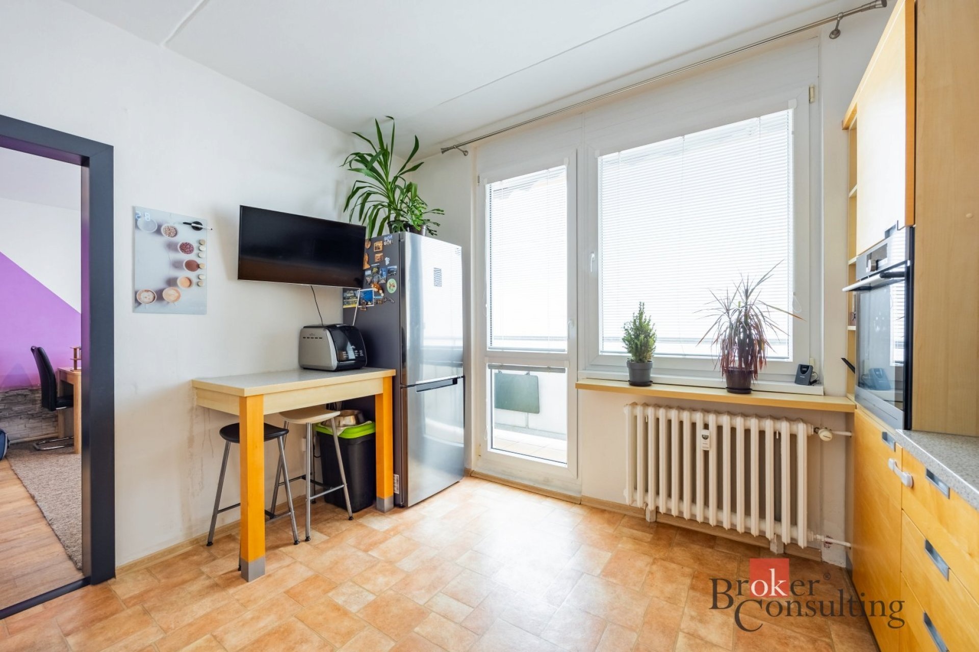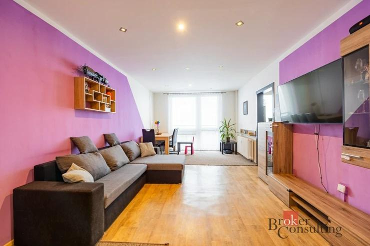 Dominantou bytu je velký a světlý obývací pokoj s jídelním koutem, který nabízí dostatek prostoru pro rodinná setkání i odpočinek. Na něj navazuje prostorná kuchyně s velkou kuchyňskou linkou, poskytující dostatek prostoru pro každodenní vaření.