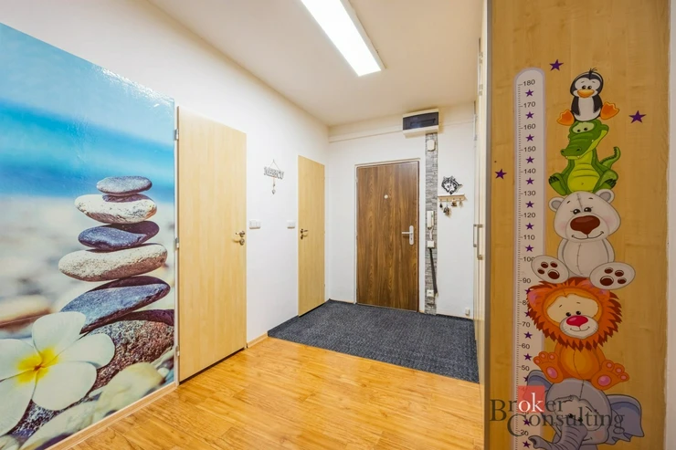 Dalšími místnostmi jsou komfortní ložnice a samostatný dětský pokoj, které poskytují dostatek soukromí i prostoru. Byt dále disponuje velkou vstupní chodbou, která působí velmi vzdušně a nabízí možnosti pro další úložné řešení. Praktickým bonusem je také komora, která zajišťuje další místo pro ukládání věcí.