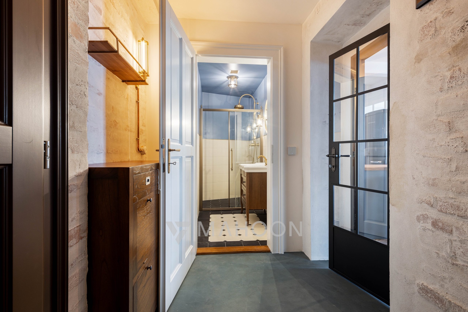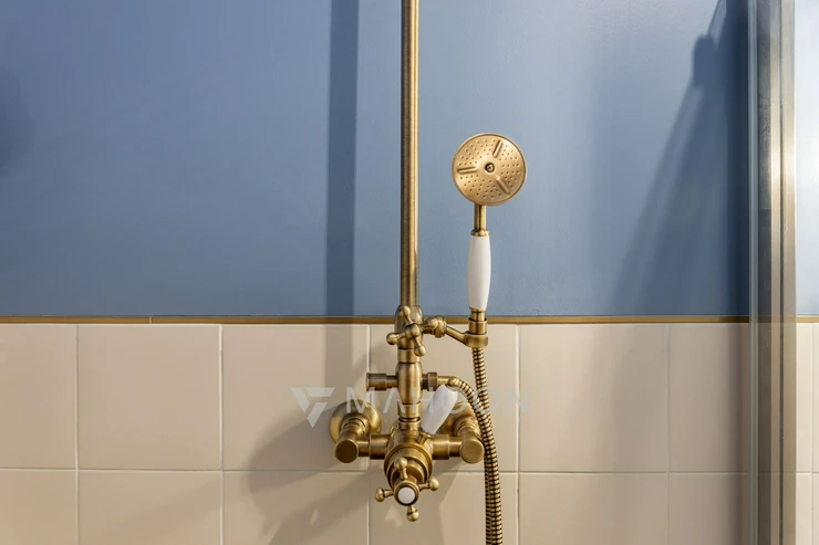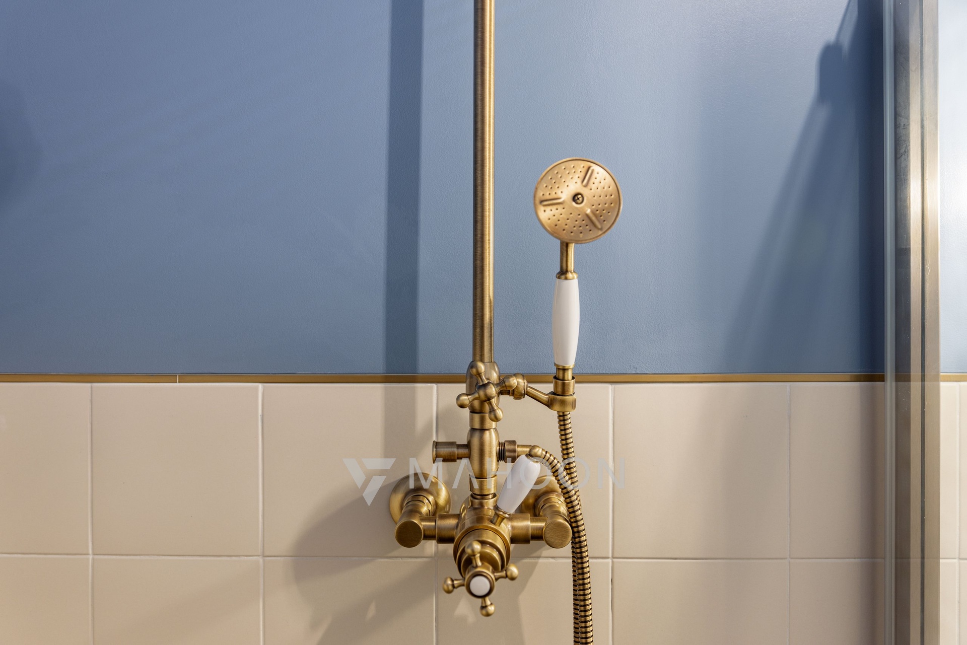 fused Italian tiles, while the sanitary ware and accessories are made of brass, all with an