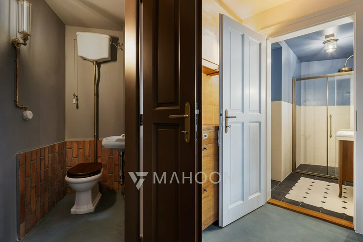 The original kitchen is made of solid oak and equipped with SMEG appliances. A similar level of quality is evident in the bathroom, which is lined with