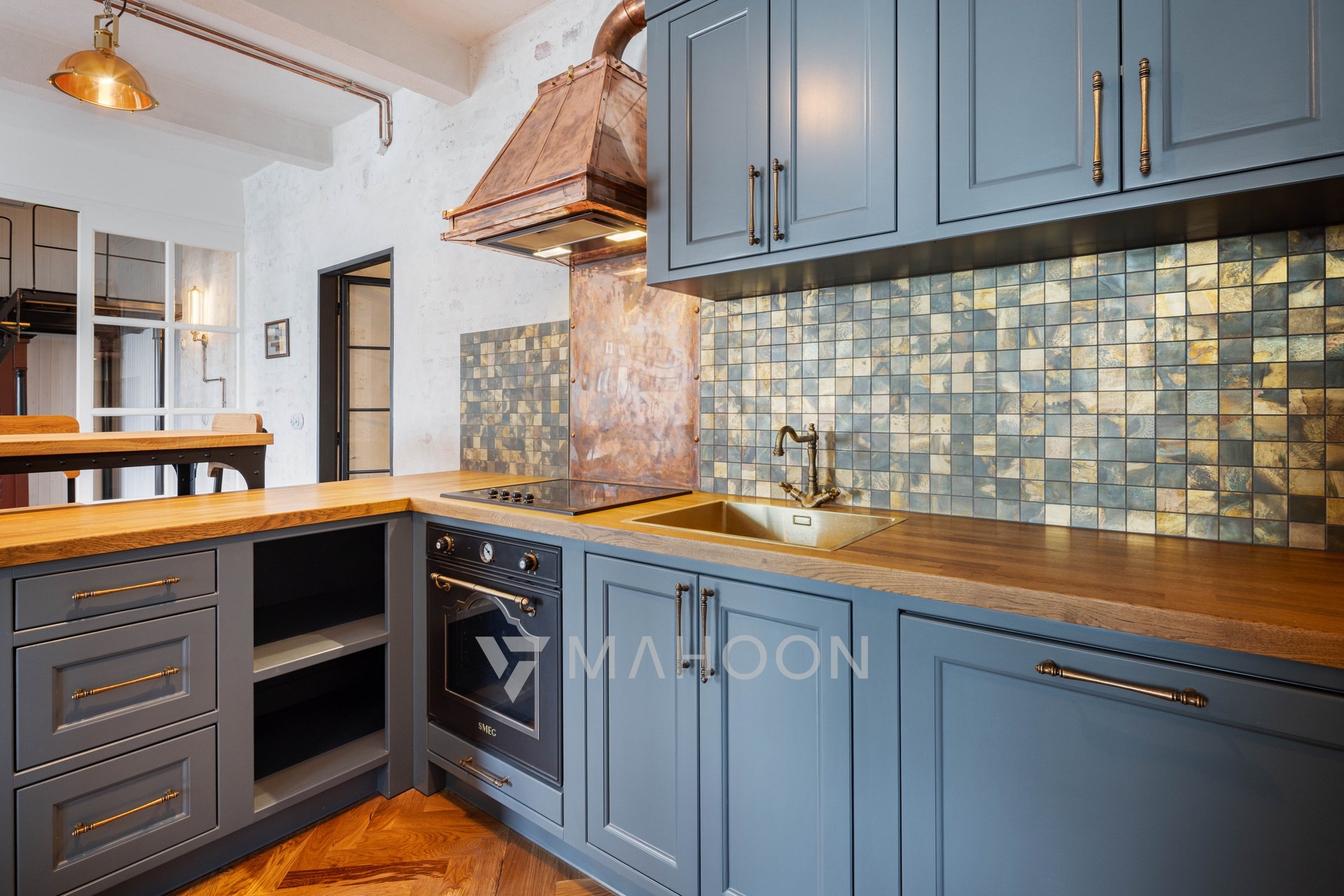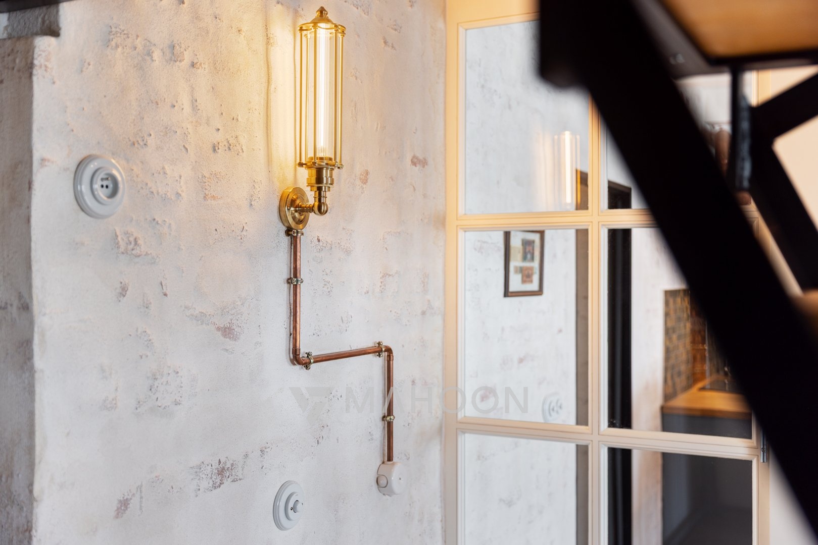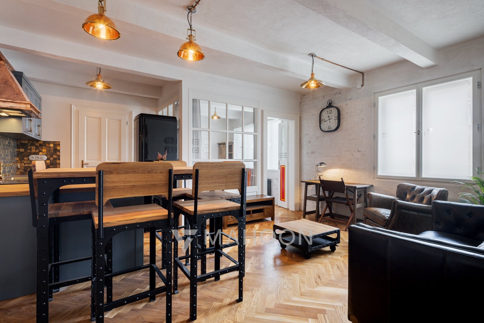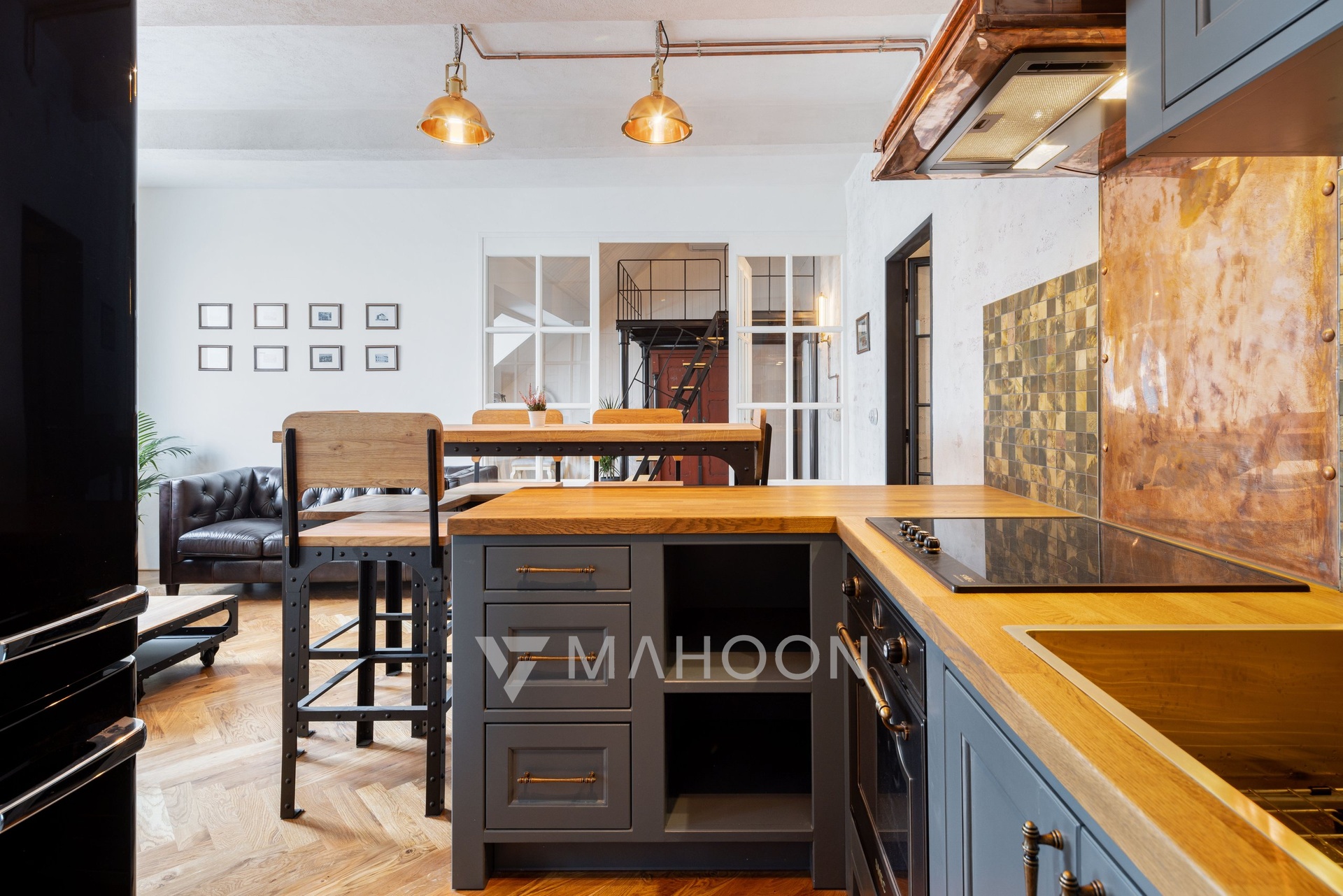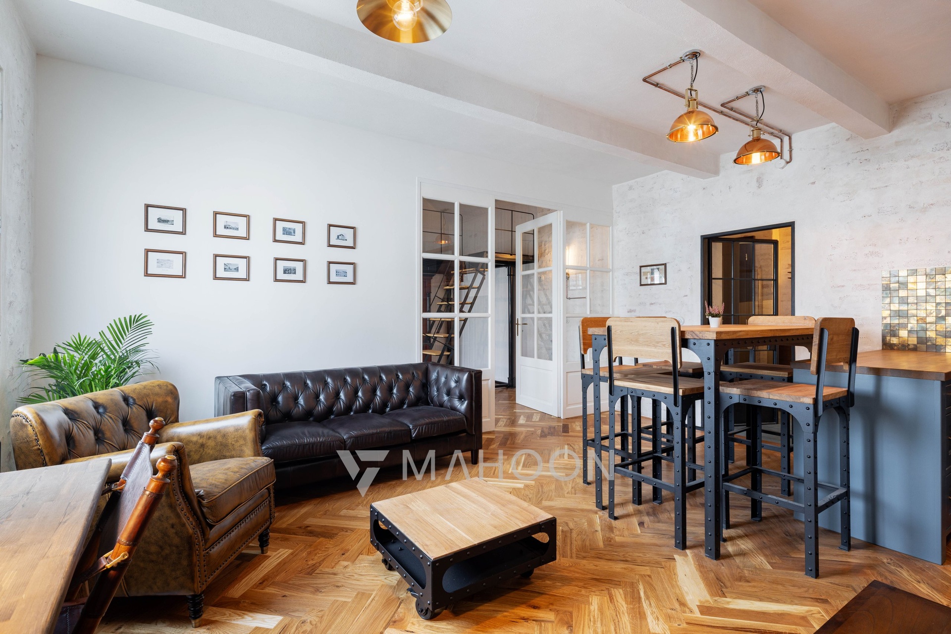 and industrial-style steel lamps combine to create an aesthetically and functionally