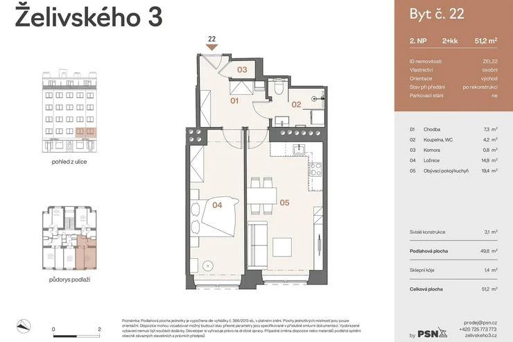 This bright one-bedroom apartment with a floor area of 49.80 m² is part of the Želivského 3 project, which brings contemporary living to the historic Žižkov district. Following a complete renovation, the building now offers comfortable and functional homes designed for everyday urban life.