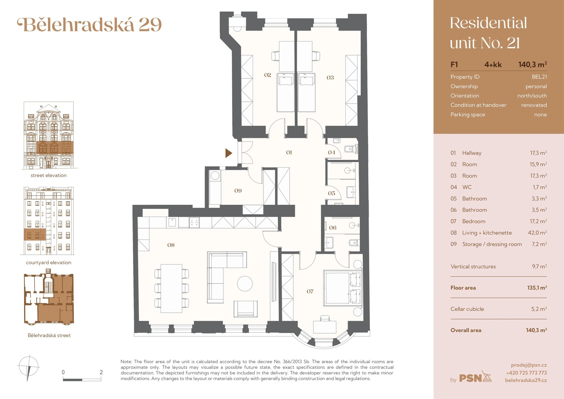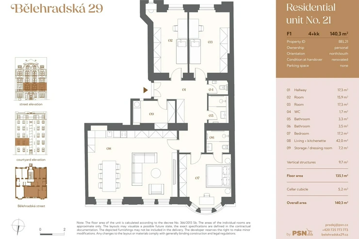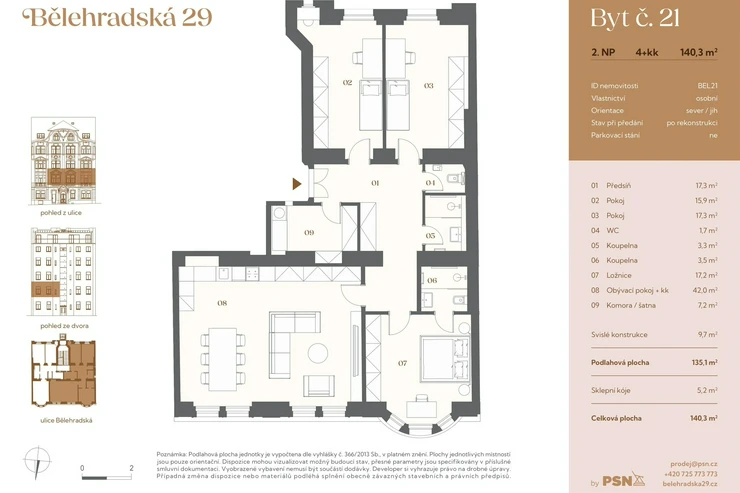 This north / south oriented three-bedroom apartment with a floor area of 135.10 m² is part of the new Bělehradská 29 residential project, which is being created by the complete reconstruction of a Neo-Baroque apartment building from 1910. It is located on the border of Vinohrady and Nusle - in a lively neighborhood with cafes, services, and greenery, just a minute from the Nuselské schody tram stop. Completion is planned for the 3rd quarter of 2026.