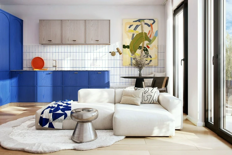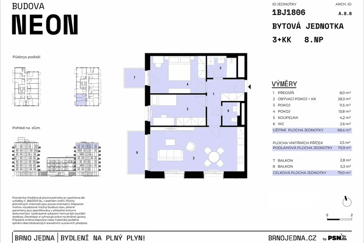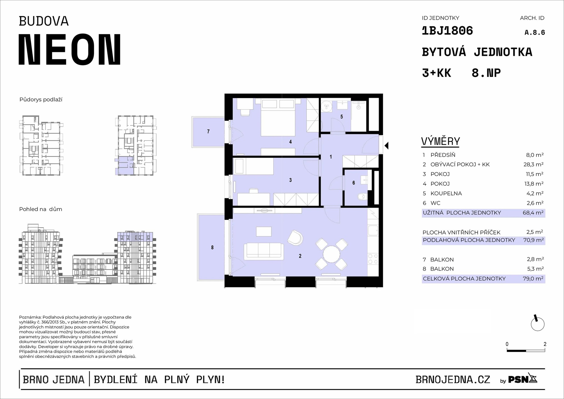 Unit no. 1806 with a two-bedroom layout and a total area of 79 m² combines practicality, style, and comfort. The dominant feature of the apartment on the 8 floor is a large living room with a kitchenette, which directly invites you to meet, cook, and relax. Two separate bedrooms provide space for peaceful sleeping, a study, or a children's room. The bathroom is equipped with a modern shower and there is also a separate WC for maximum comfort in everyday life. Thanks to its orientation to the J, Z, the interior is bright, pleasant and has an airy feel. The unit includes a balcony with an area of 8.10 m², ideal for relaxing evenings or for enjoying breakfast in the fresh air. The apartment will be ready to move into immediately with finished floors, a fitted bathroom, and a space for a kitchen unit. Standards include high quality materials, triple-glazed windows, and in selected units, preparation for outdoor shading.