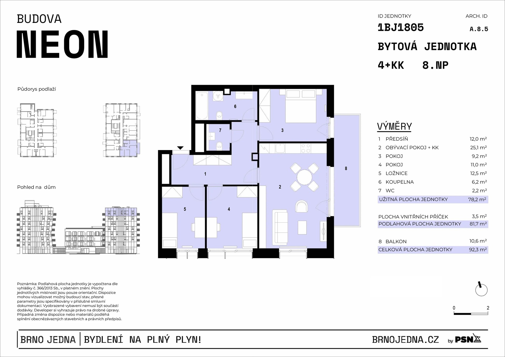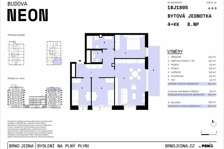 Brno Jedna, or Brno One, is more than just a residential building, it is a place where your family will live well. The building boasts a roof terrace with a grill, a workout zone, a bike room, a laundry room, and a stroller room - all of which will offer you the comfort of urban life. A new district with a park, bike paths, and services is developing nearby. The city center is within reach in just 5 minutes by public transport or by car.
