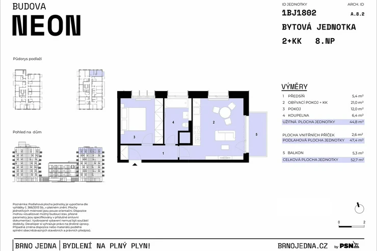 Brno Jedna, or Brno One, is more than just a residential building, it is a place where you will live well. The building boasts a roof terrace with a grill, a workout zone, a bike room, a laundry room, and a stroller room - all of which will offer you the comfort of urban life. A new district with a park, bike paths, and services is developing nearby. The city center is within reach in just 5 minutes by public transport or by car.