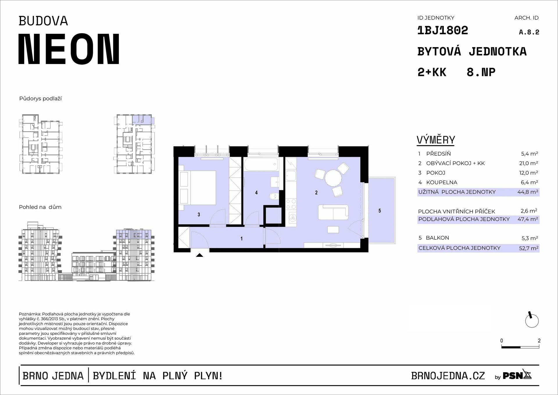 Unit no. 1802 with a one-bedroom layout and a total area of 52.70 m² on the 8 floor will offer you a harmonious space for living, whether you are looking for your own apartment or are a couple starting a joint chapter. The airy living room with a kitchenette freely flows into the bedroom, which is complemented by an elegant bathroom with a shower and toilet. Thanks to its orientation to the S, V, the apartment enjoys an ample amount of natural light. The unit includes a balcony, perfect for enjoying your morning cup of coffee in the fresh air. A cellar and a parking space must be purchased for each unit. The apartment will be ready to move into immediately with finished floors, a fitted bathroom, and a space for a kitchen unit. Standards include high quality materials, triple-glazed windows, and in selected units, preparation for outdoor shading.