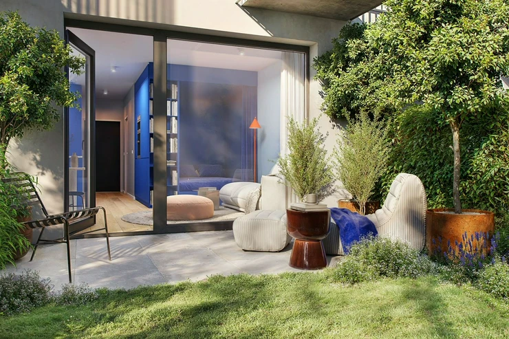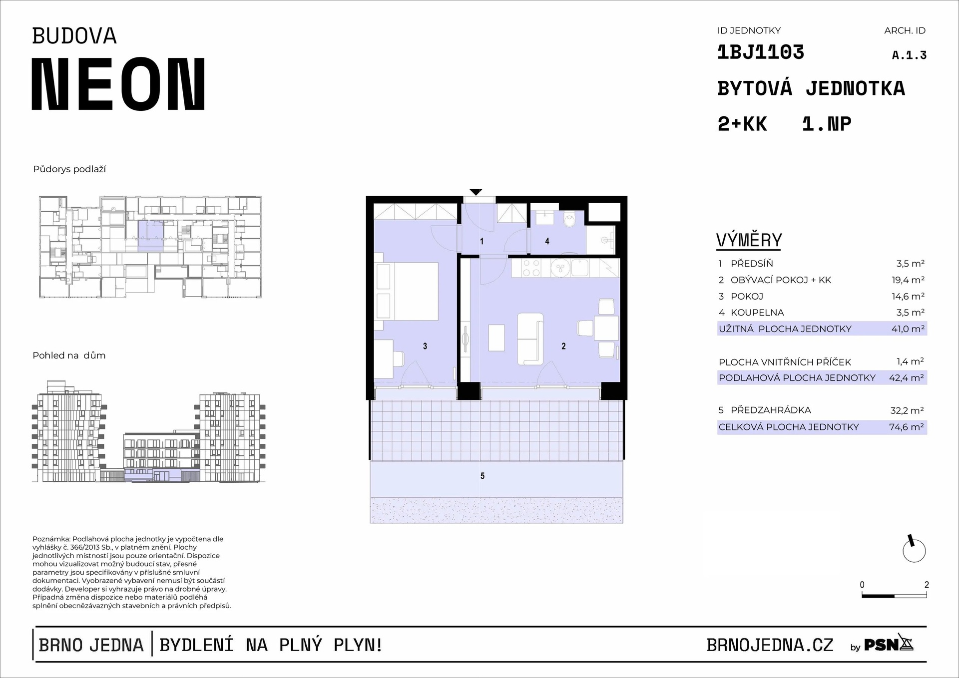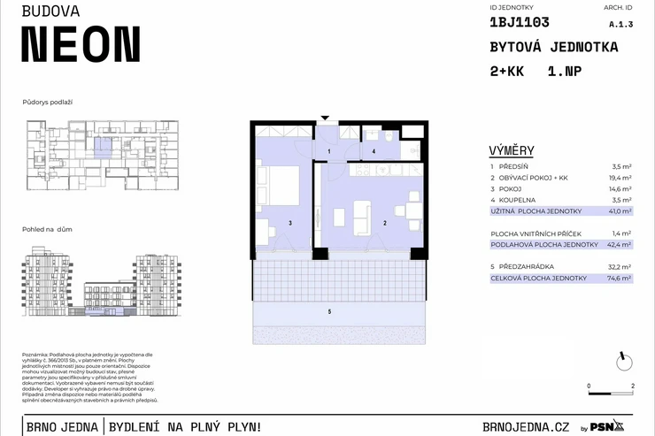 Unit no. 1103 with a one-bedroom layout and a total area of 74.60 m² on the 1 floor will offer you a harmonious space for living, whether you are looking for your own apartment or are a couple starting a joint chapter. The airy living room with a kitchenette freely flows into the bedroom, which is complemented by an elegant bathroom with a shower and toilet. Thanks to its orientation to the J, the apartment enjoys an ample amount of natural light. The unit includes a front garden, perfect for enjoying your morning cup of coffee in the fresh air or growing herbs. A cellar and a parking space must be purchased for each unit. The apartment will be ready to move into immediately with finished floors, a fitted bathroom, and a space for a kitchen unit. Standards include high quality materials, triple-glazed windows, and in selected units, preparation for outdoor shading.
