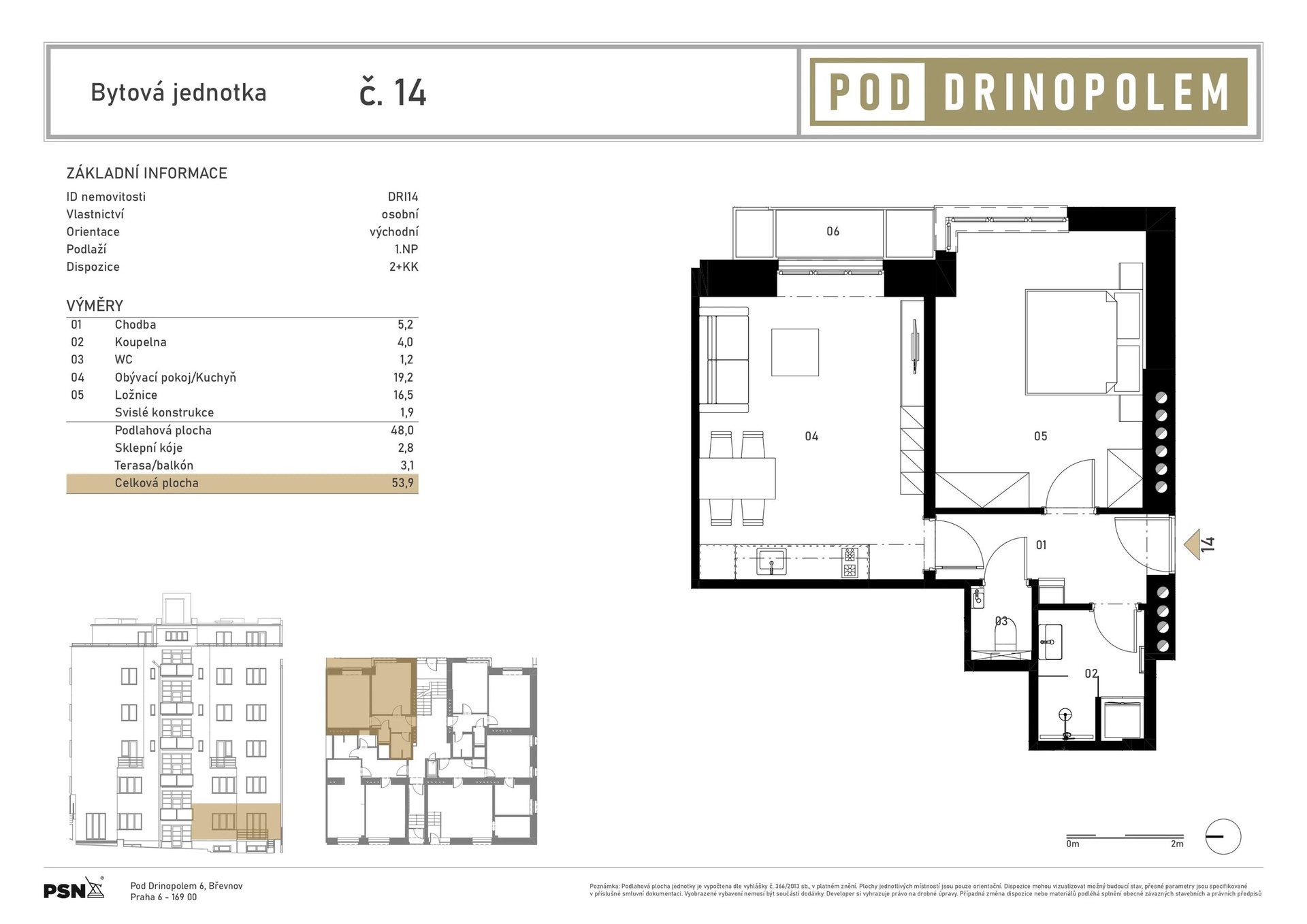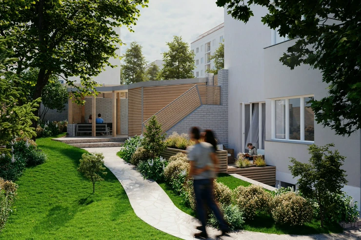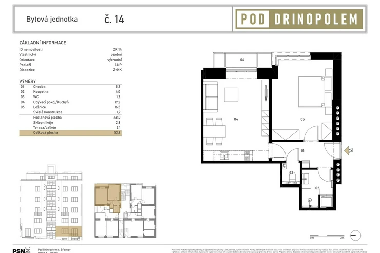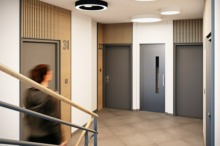 The building is undergoing a complete renovation, which includes a new elevator, entrance portals with security doors, and stylish common areas with ceramic tiles and wooden elements. Residents will have access to a wellness area with a sauna and a gym, a bicycle storage room, a laundry room, and a landscaped courtyard with seating – perfect for a little rest and relaxation. The residence is located on Pod Drinopolem, a quiet street surrounded by trees and residential buildings. All civic amenities including shops, cafes, schools and public transport stops are within walking distance. The location offers a calm environment with quick connections to the city center and the airport.