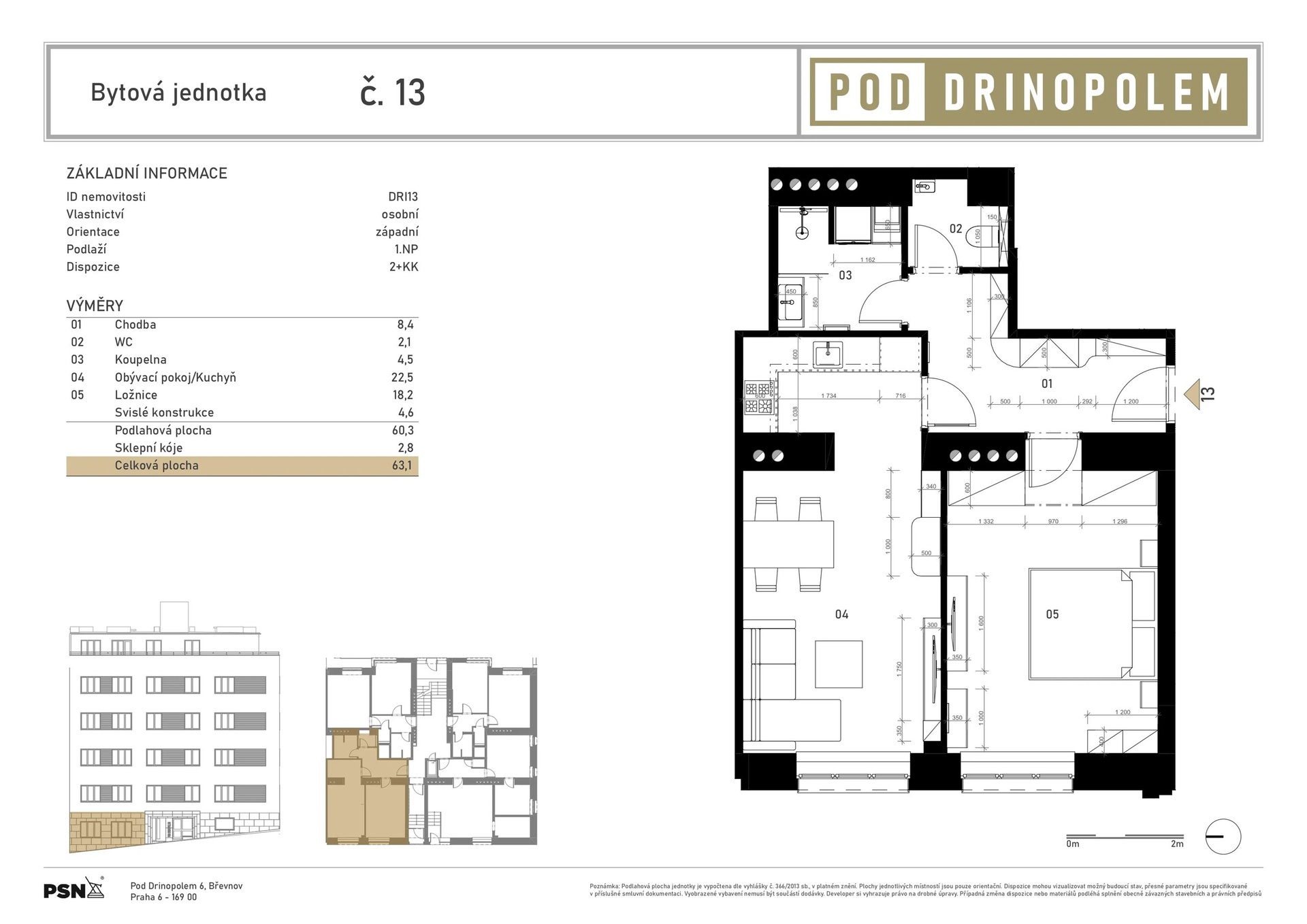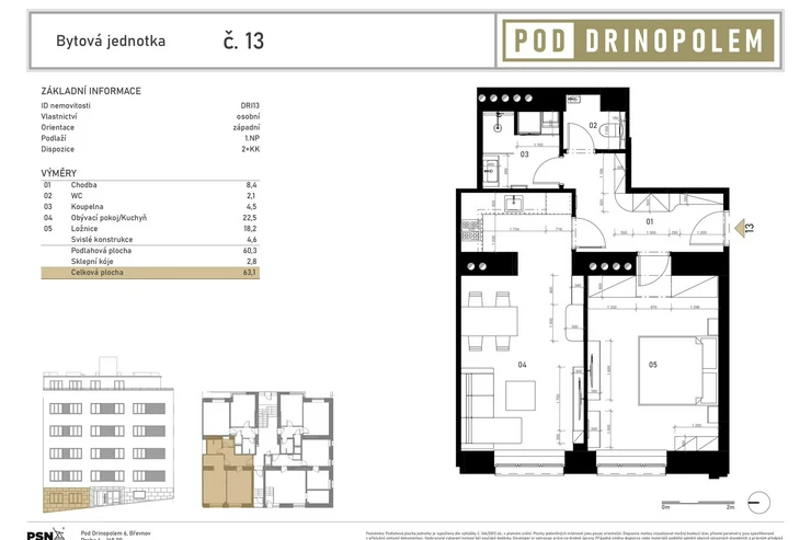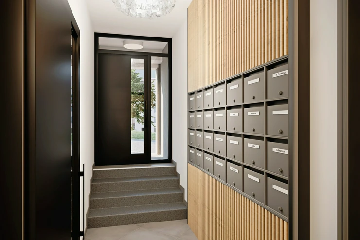 The building is undergoing a complete renovation, which includes a new elevator, entrance portals with security doors, and stylish common areas with ceramic tiles and wooden elements. Residents will have access to a wellness area with a sauna and a gym, a bicycle storage room, a laundry room, and a landscaped courtyard with seating – perfect for a little rest and relaxation. The residence is located on Pod Drinopolem, a quiet street surrounded by trees and residential buildings. All civic amenities including shops, cafes, schools and public transport stops are within walking distance. The location offers a calm environment with quick connections to the city center and the airport.