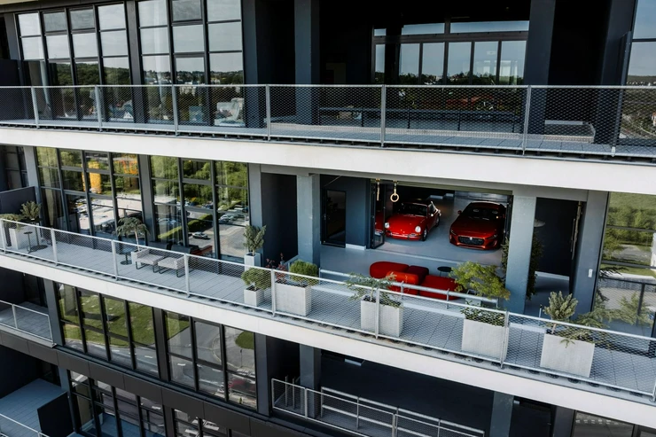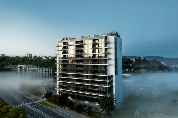 The apartment on the floorNo. floor also includes a private garden, extending the living space and providing a pleasant spot to relax with views of the surroundings. The unit also includes a cellar space. The building’s high standards include a glass facade, brick and double soundproof partitions between the units, fire-resistant glass partitions, videophones, preparation for exterior blinds, air-conditioning, heat recovery, and more. Residents can enjoy a reception desk with concierge service, a wellness and spa zone, a fitness center, a cinema / party room, a glass 18-meter swimming pool, a meeting room, and a laundry room.