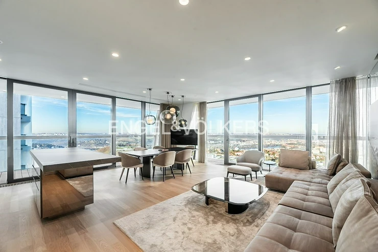Luxury living near the top of one of Prague’s most iconic residential towers. This exclusive 3+kt apartment, with an interior area of 132 m² and a 57 m² terrace, is located on the 27th floor of the east tower of the prestigious V Tower residence in Pankrác. It offers breathtaking views of the Prague skyline while ensuring maximum privacy.