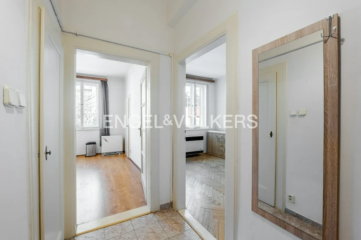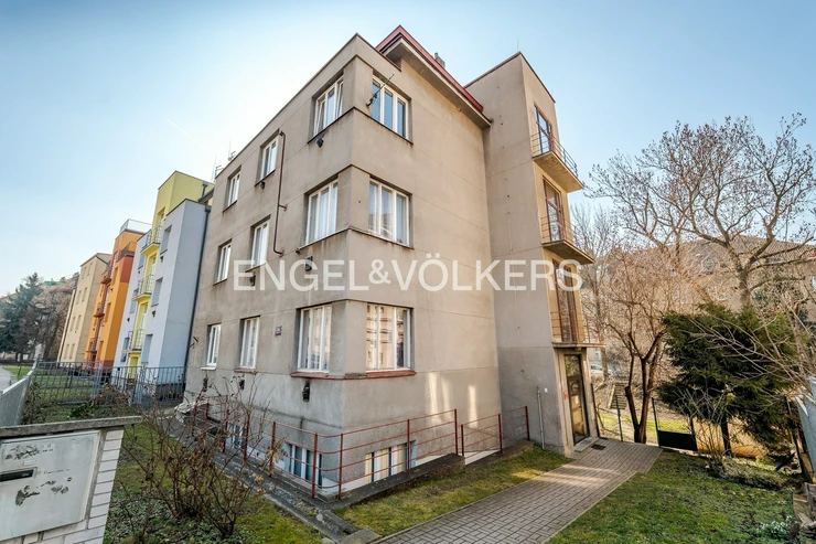 Due to its 2+kt layout and modernization potential, the apartment can offer comfortable living as well as interesting investment potential. The apartment is situated in a well-maintained brick building that has undergone reconstruction and is in stable technical condition. The second floor offers a pleasant compromise between accessibility and sufficient distance from the street. The apartment includes a metal cellar cubicle in a newly renovated basement. A shared garden is also available. HOA (SVJ) fees and utilities amount to 4,870 CZK per month.