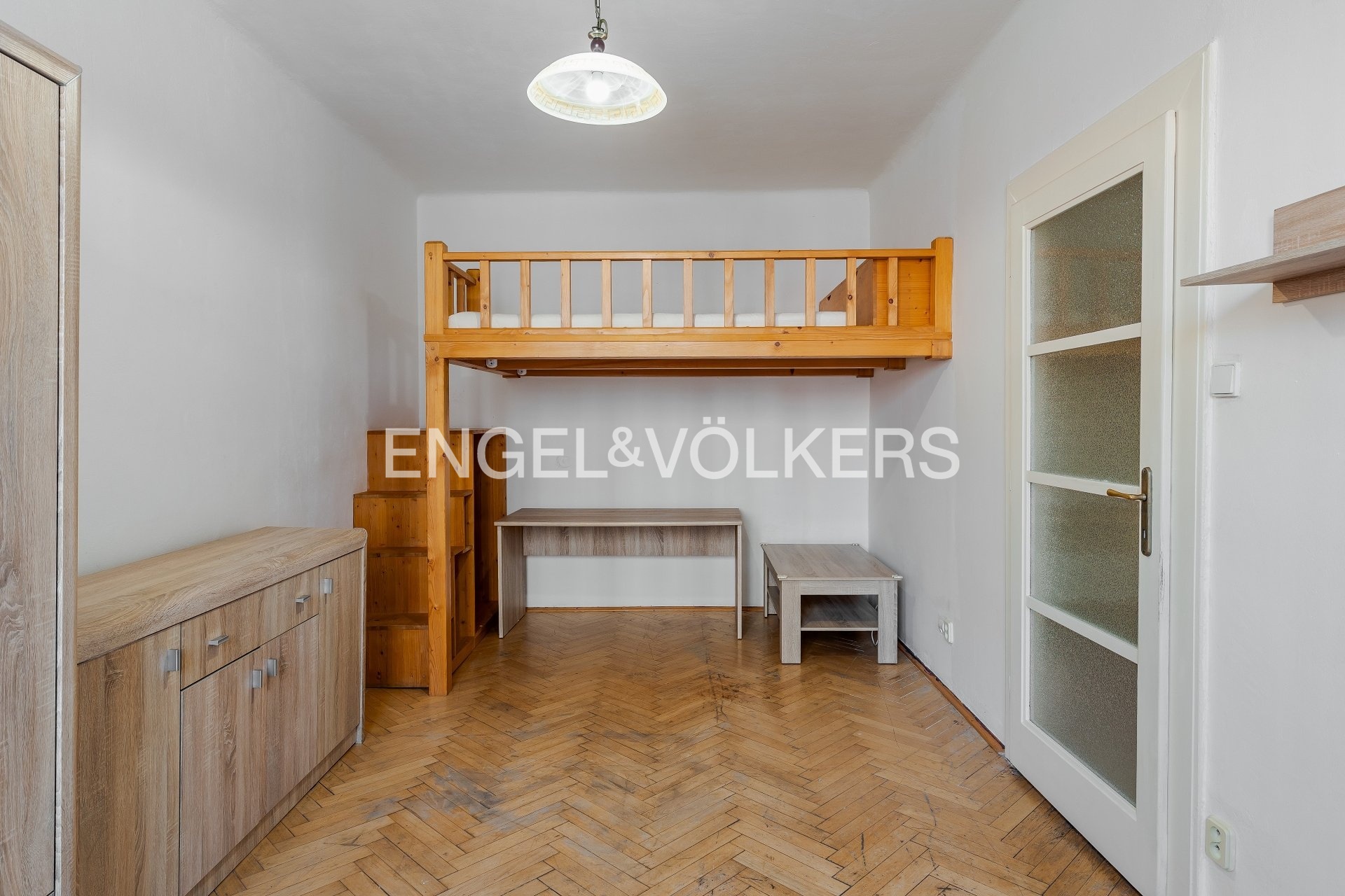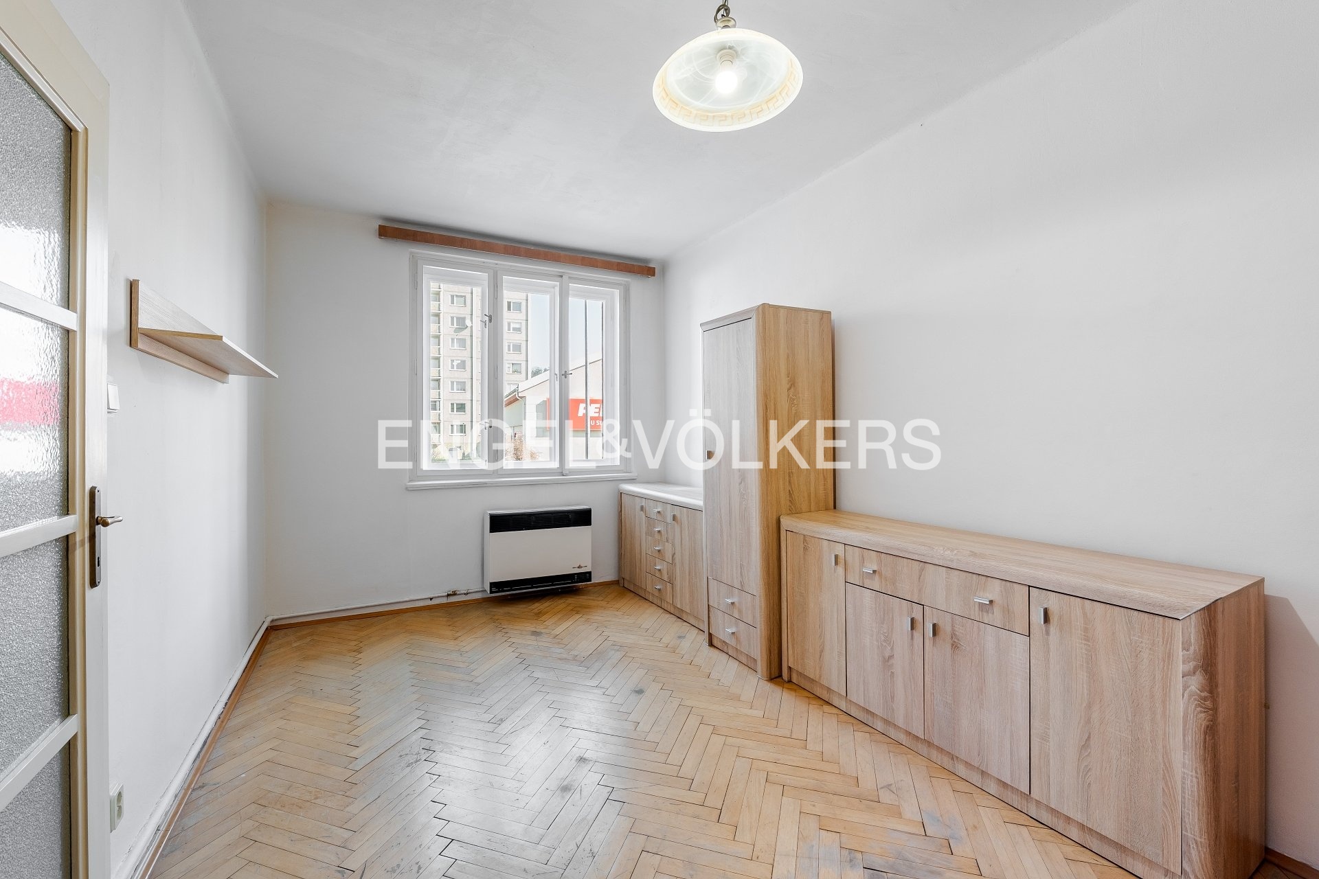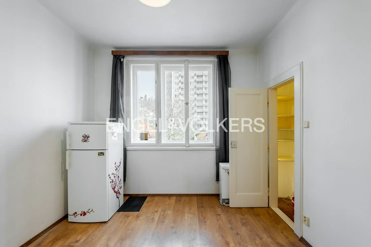 We offer for sale a 2+kt apartment located on the raised 2nd floor (1st floor above ground) of a brick building in Ke Krči Street in Prague's Braník district. The apartment is in a well-maintained condition and represents an ideal opportunity for renovation according to the new owner's wishes. The interior has retained some original features, especially wooden parquet floors in the living room and classic casement windows, which add character to the space. Heating is local – a WAW gas heater in one room and storage heaters in the other. Thanks to a loft bed arrangement, the floor area remains free for further use, making the room feel airier.