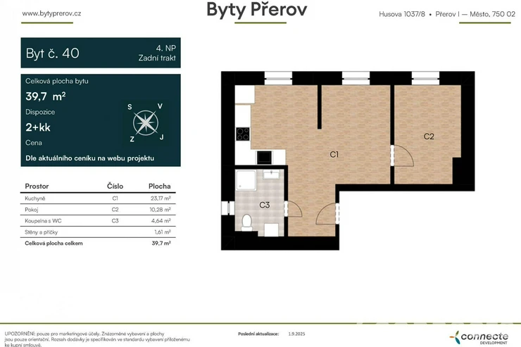 As part of the Byty Přerov development project, we exclusively offer for sale a modern 2+kk apartment with a total area of 40.3 m2, situated on the 3rd floor, into private ownership.