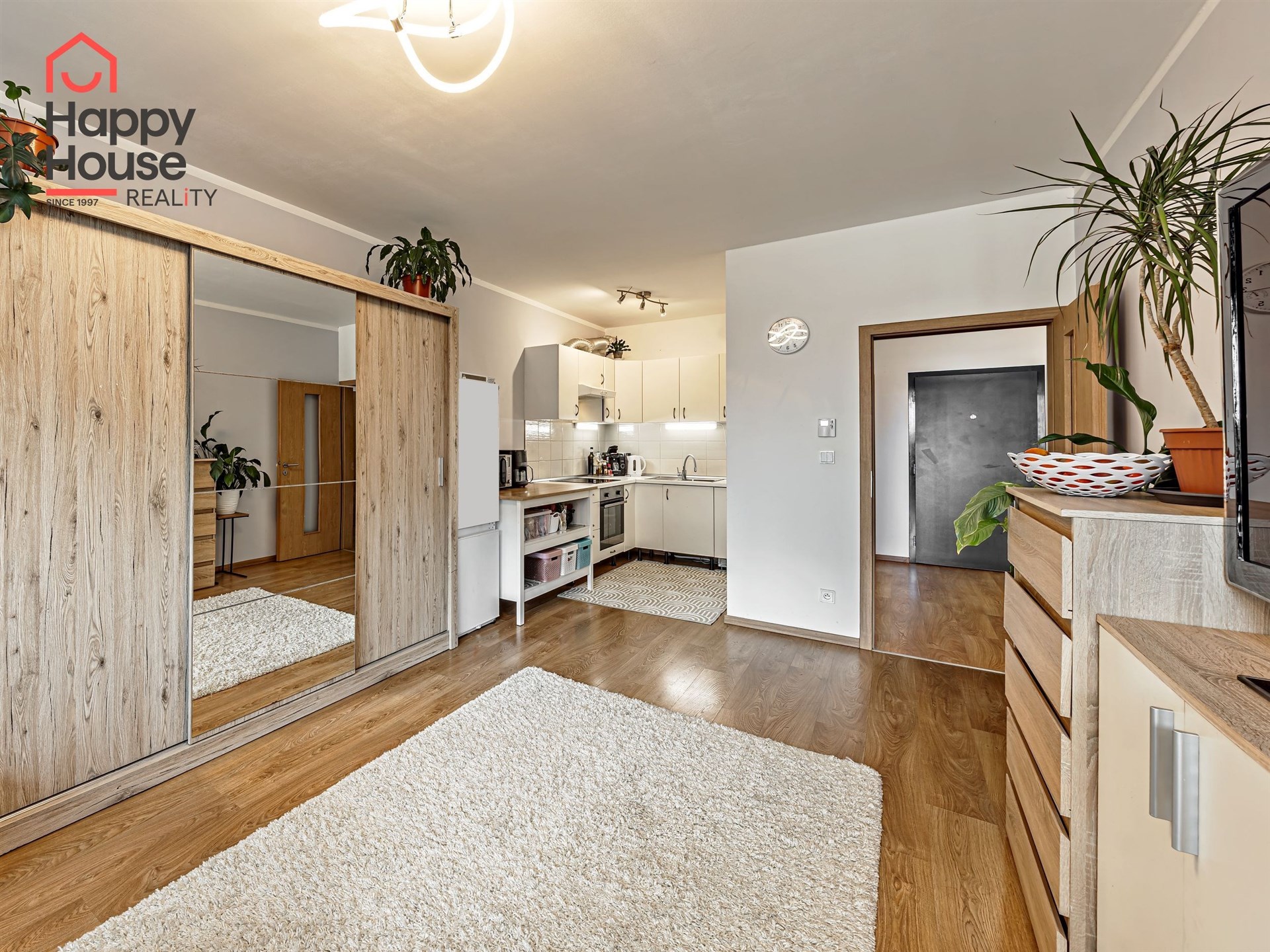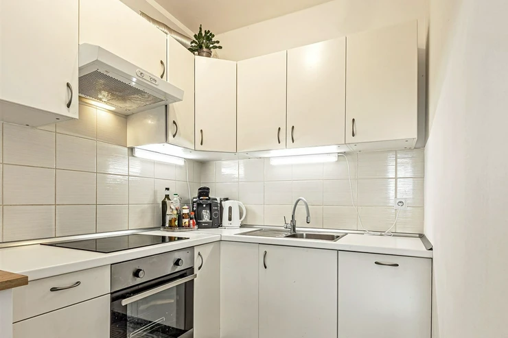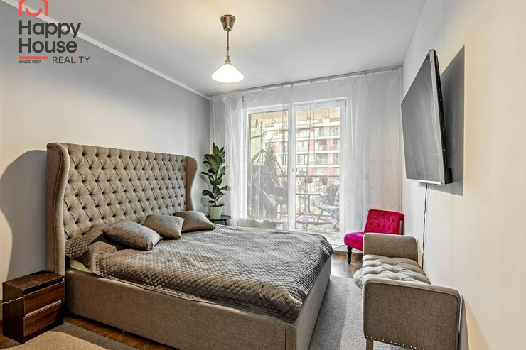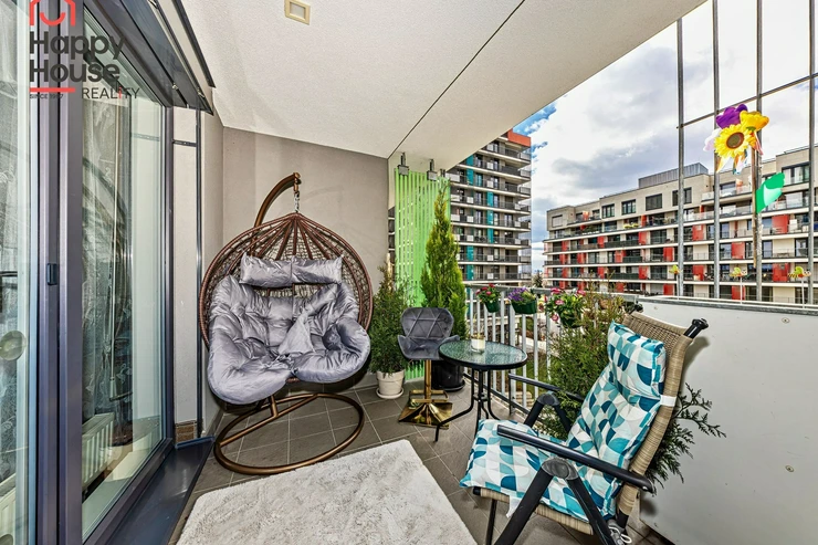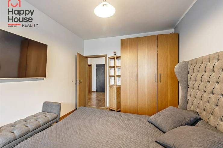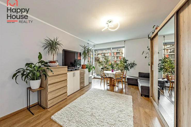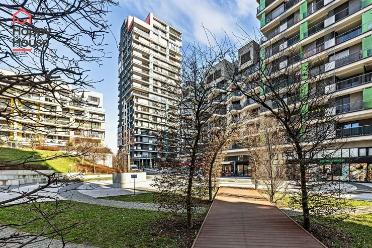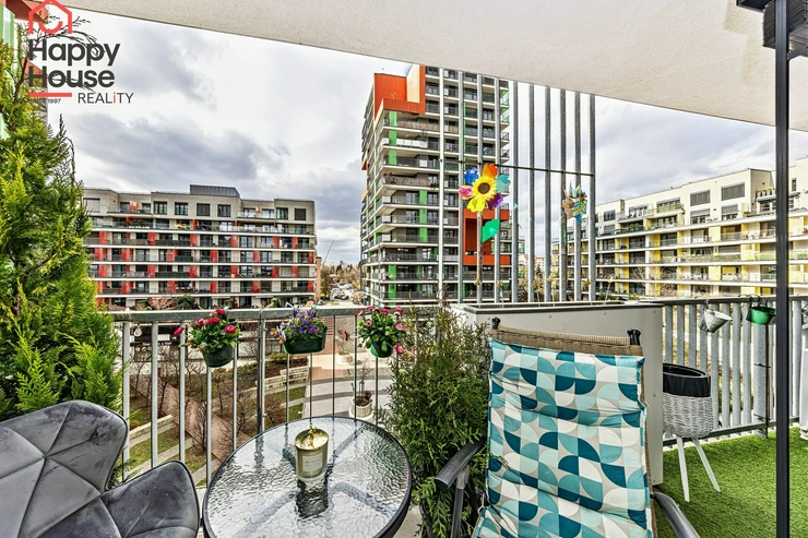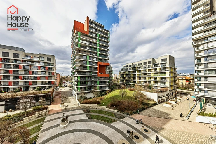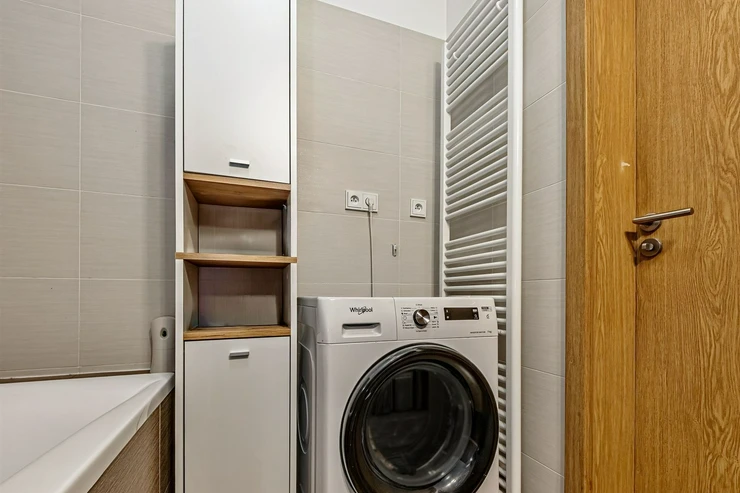 We are offering for sale a bright, cozy one-bedroom apartment with a living area of 57 sqm that includes a spacious loggia (9.8 sqm) on the 3rd floor of a newly constructed building with an elevator from 2013, located in Prague 10 - Malešice. The apartment unit faces west. A notable feature is that the loggia is accessible both from the living room and the bedroom. Upon entering, the interior of the apartment presents a spacious hallway, a living room with a kitchenette (26.9 sqm), a bedroom (14.6 sqm), a bathroom with a bathtub and a heated towel rail, a separate toilet with a small sink, and a storage closet (1.6 sqm). The kitchenette is equipped with kitchen unit, a ceramic hob, an electric oven, a dishwasher, a refrigerator, and an extractor hood that vents to a central ventilation system. Ample storage space is available in a built-in wardrobe in the hallway, in the bedroom, and in the previously mentioned storage closet. The apartment has central heating with a thermostat, plastic windows, laminate floors, and tiles. It also features a security door. The apartment includes one parking space in the underground garage. Vodafone and O2 are available in the building. The energy performance certificate indicates class C.
