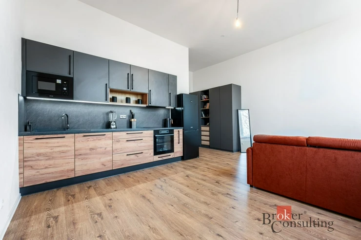 Po vstupu do bytu projdete chodbou do prostorného obývacího pokoje propojeného s moderním kuchyňským koutem v elegantním designu. Kuchyňská linka je vybavena troubou, mikrovlnnou troubou, indukční varnou deskou, digestoří a myčkou.