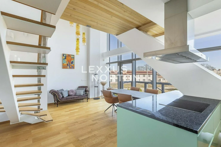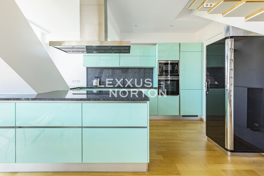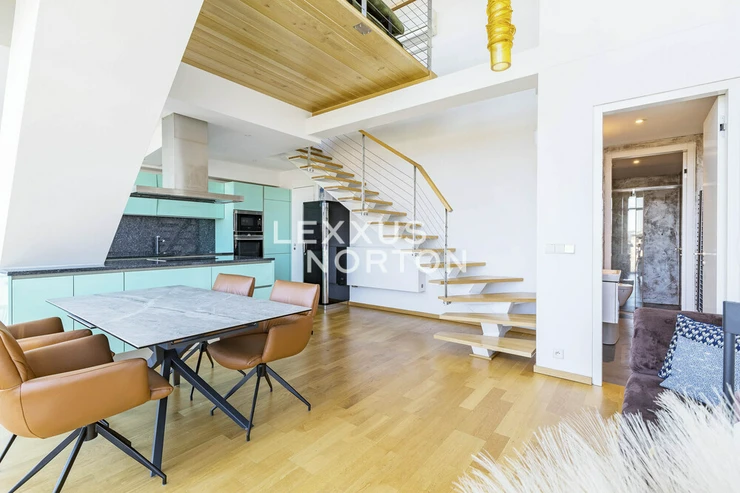 We are offering for sale an attractive duplex apartment with a total area of 134 sqm, featuring a 36 sqm terrace and a 3 sqm basement, which stands out primarily for its unique panoramic views of Prague. The apartment is located in the prestigious SACRE COEUR 2 residential complex, in a quiet part of Smichov with excellent accessibility and close to green spaces.The lower level consists of an open and bright living area with a modern kitchen and direct access to the terrace. The terrace offers plenty of privacy and a pleasant space for daily relaxation and socializing. This level also includes a bathroom with a toilet.The dominant feature of the interior is an oak staircase leading to the upper floor, where there is a gallery used as a relaxation area. You’ll also find a bedroom with its own walk-in closet and direct access to a bathroom with a bathtub.The apartment is fully furnished and ready for immediate occupancy. The kitchen is equipped with built-in AEG appliances. The sale also includes all furniture, a TV, a washer, a dryer, air conditioning, and an outdoor seating area with a hot tub on the terrace. A parking space is also available for purchase with the apartment.Emphasis was placed on high-quality materials and timeless design—wooden floors, large-format tiles, and coordinated interior elements create a pleasant and elegant atmosphere.The residence features a 24-hour reception desk, ensuring both comfort and the safe operation of the building.This apartment presents an attractive opportunity for clients seeking comfortable living with a terrace, privacy, and beautiful views in the wider center of Prague.The residence is located in the prestigious Prague 5 – Hrebenky neighborhood, on Holeckova Street, in the immediate vicinity of Kinsky Garden. Petrin, Lesser Town, Prague Castle, the National Theater, and Charles Bridge are all within walking distance. The location offers peaceful living with excellent access to the city center and a full range of amenities, including the Novy Smichov shopping center.