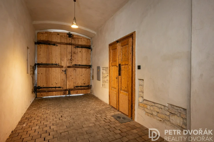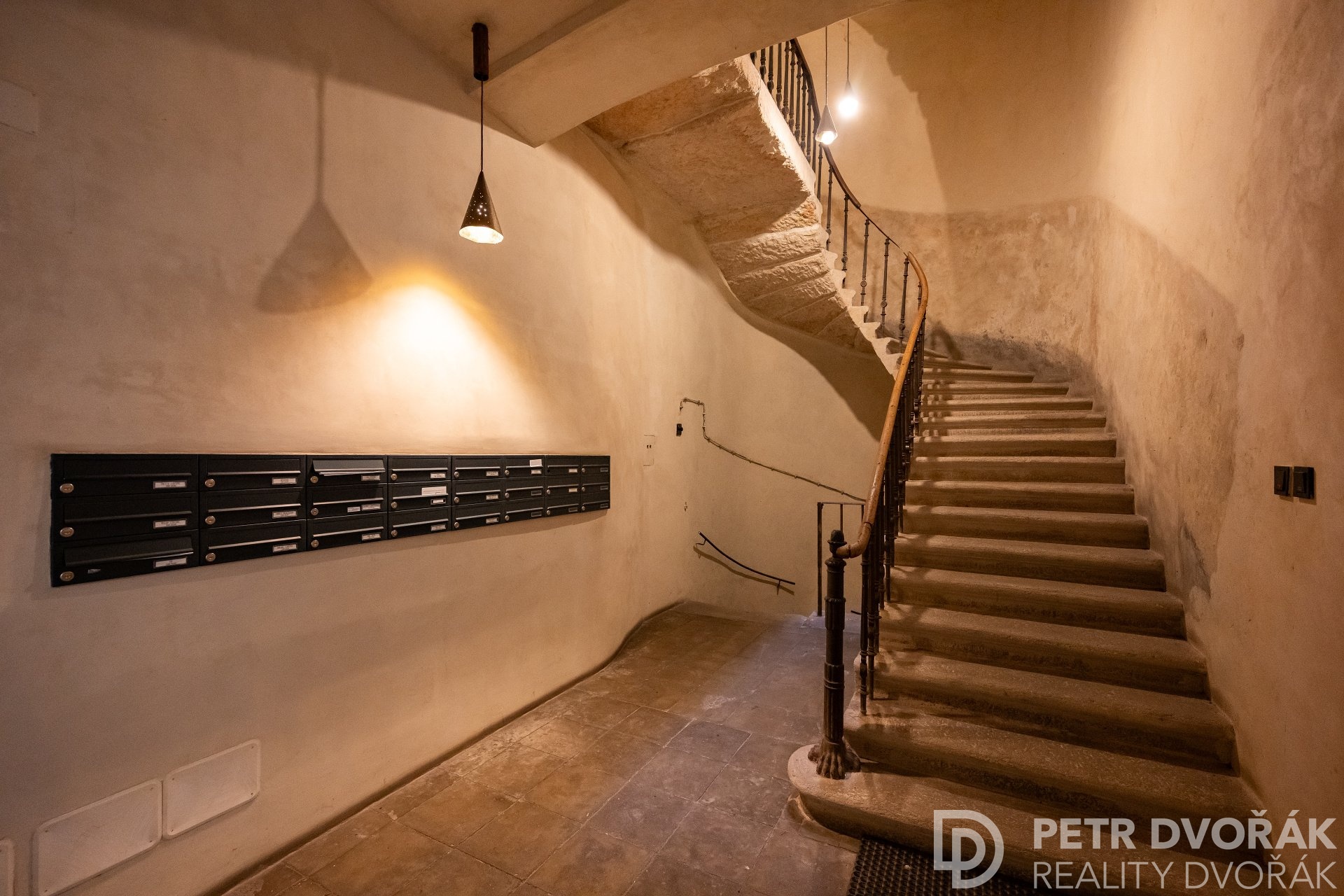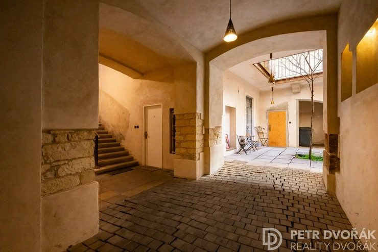 The house dates from the 15th century and forms part of the Prague Historic Reserve, inscribed on the UNESCO World Heritage List. It has undergone a sensitive restoration with careful attention to preserving its original character – exposed stone masonry, a stone staircase with cast iron balusters, and stone paving in the passageway all bear witness to its centuries-long history. The intimate inner courtyard with its tree has also been restored; it conceals a bicycle and pram storage room and offers a second exit through a carriage gate into the quiet alley Za Haštalem, one of the most hidden medieval corners of the Old Town.