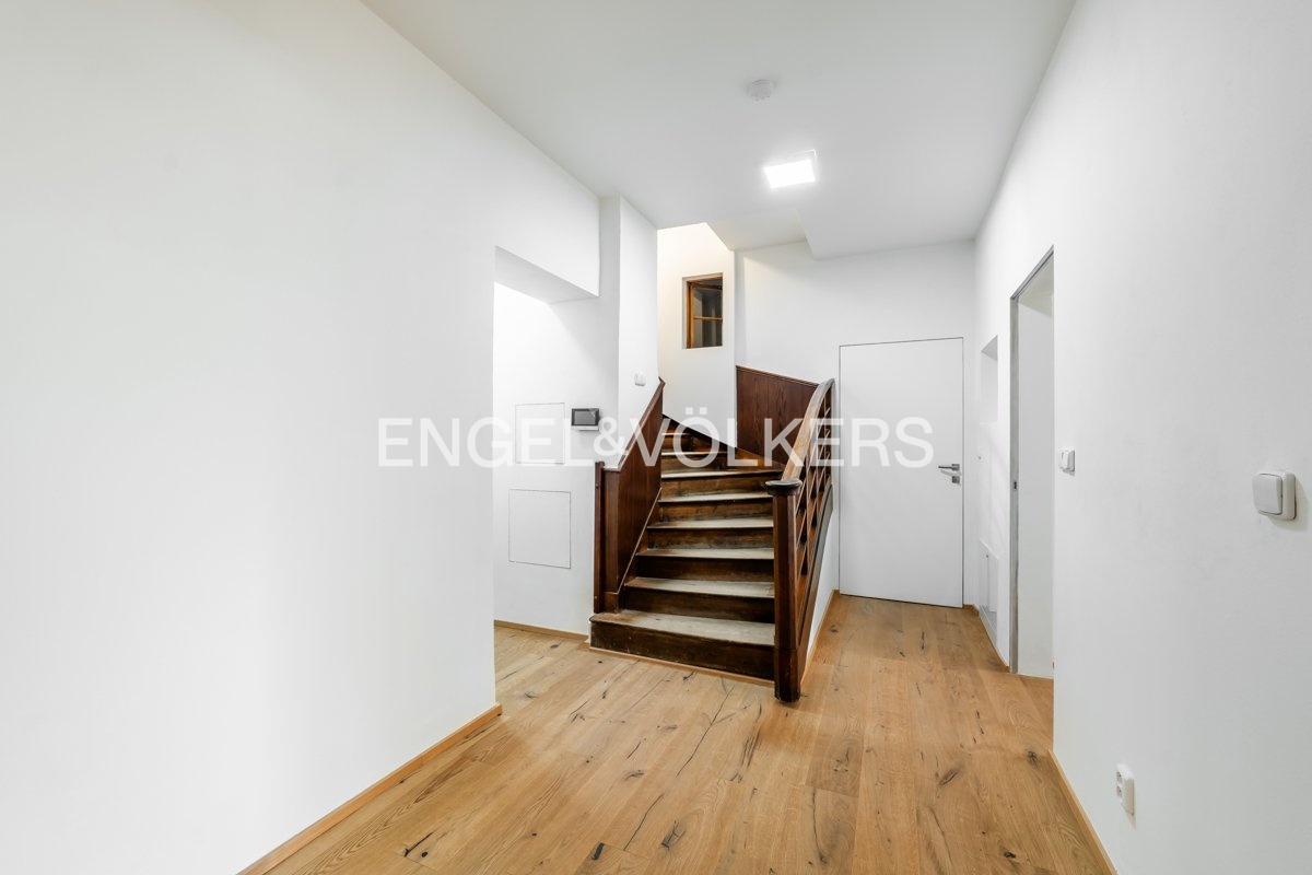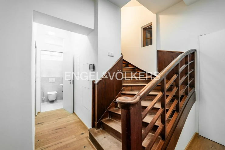 The interior features three bedrooms, one of which is accessible via a hallway with space for a kitchen unit. The apartment also has a generous practical storage room, one bathroom, and two toilets. There are two entrances to the apartment – one from the building and the other directly from the covered parking space, which increases the comfort and practicality of everyday use. Stylish details such as wooden floors, refurbished double wooden windows, and an original wooden staircase underline the unique character of the entire space.