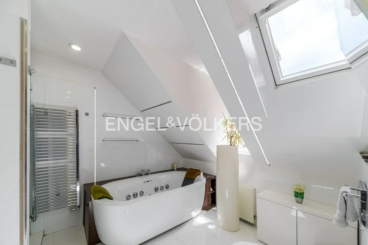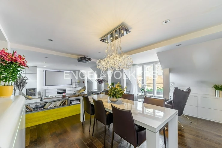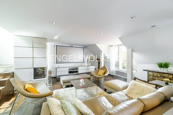 The living room has two French windows with balconies and a small flower garden with an exceptional view of the rooftops of the Old Town and the nearby church. One part of this generous space has a fireplace clad in white marble (and hidden firewood storage), and a large movie screen (with a projector on the ceiling) for large screen projection.