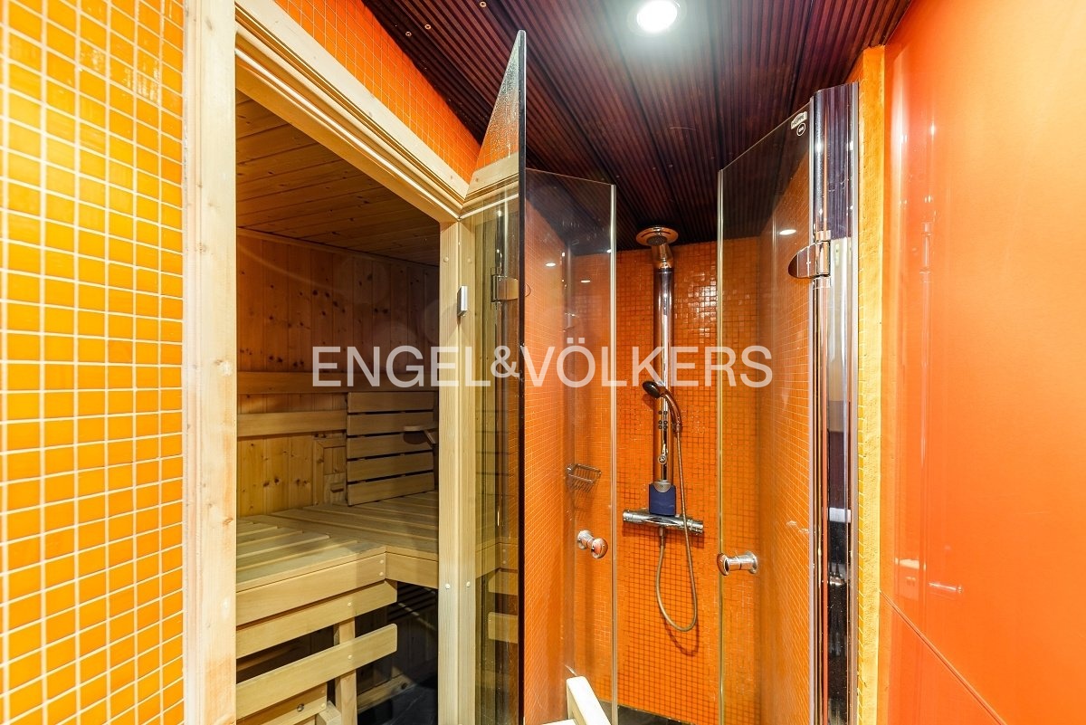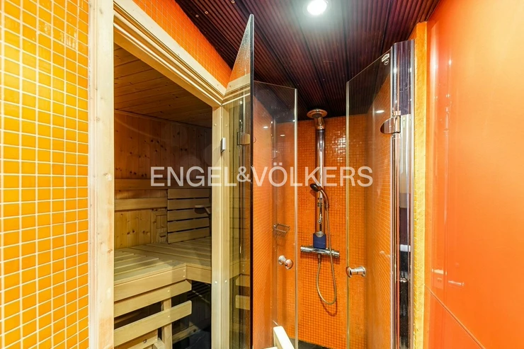 The apartment is entered on the second floor of the building. There is a built-in wardrobe in the hallway, several steps down to the sauna for two people, storage space for sauna equipment and a shower. Above the sauna is a relaxation area dominated by a glass wall facing the courtyard. There is an audio system with speakers in this area and also in the sauna.