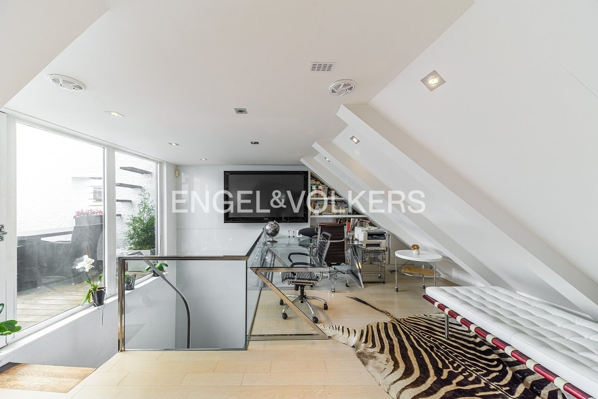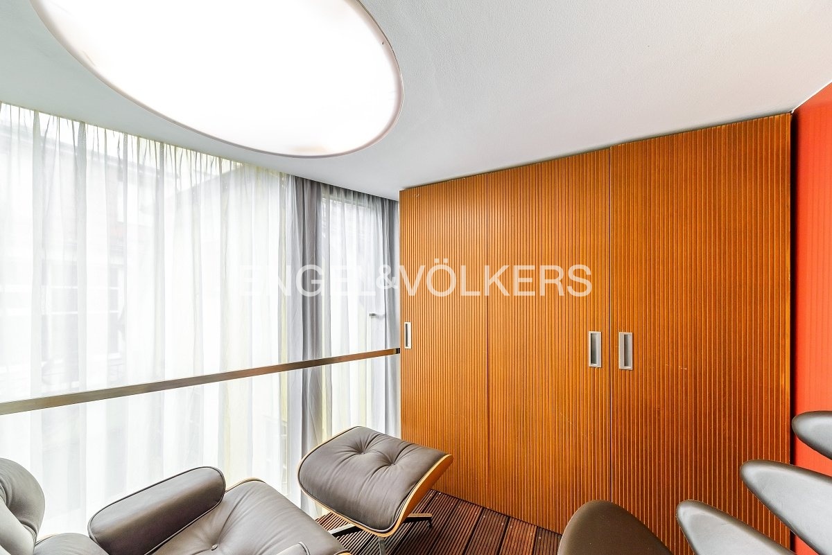 The fully equipped kitchenette area (including dishwasher, American fridge, wine cabinet, built-in coffee maker and serving counter open to the space) has a dining table for 6 - 8 people. A bookcase has been built along one wall, and the space at the entrance to the second balcony serves as a café area with two chairs.