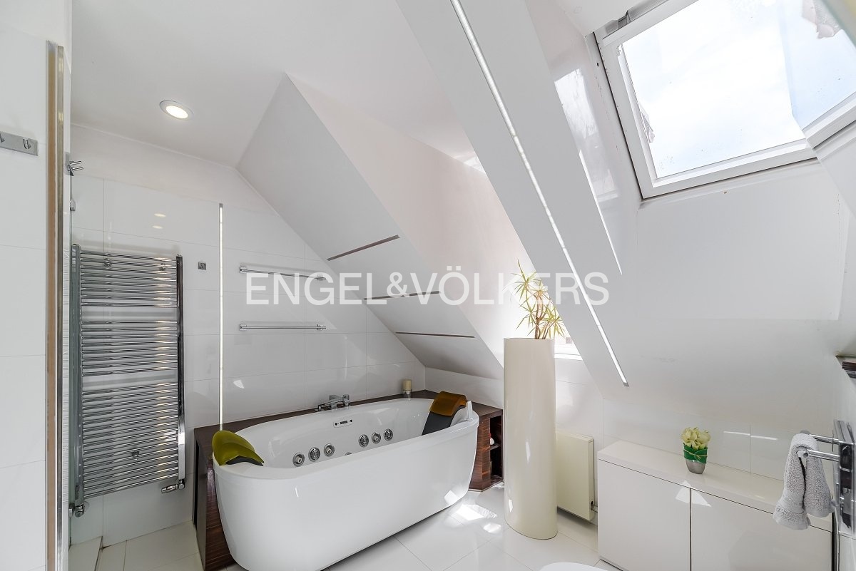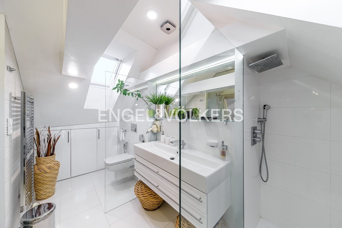 On the last floor, there are two rooms, one serves as a guest room, it has a separate bathroom with window, shower and toilet. There are two large windows in the room, one of them has a fourth smaller balcony overlooking the rooftops of the Old Town and has a built-in wardrobe.