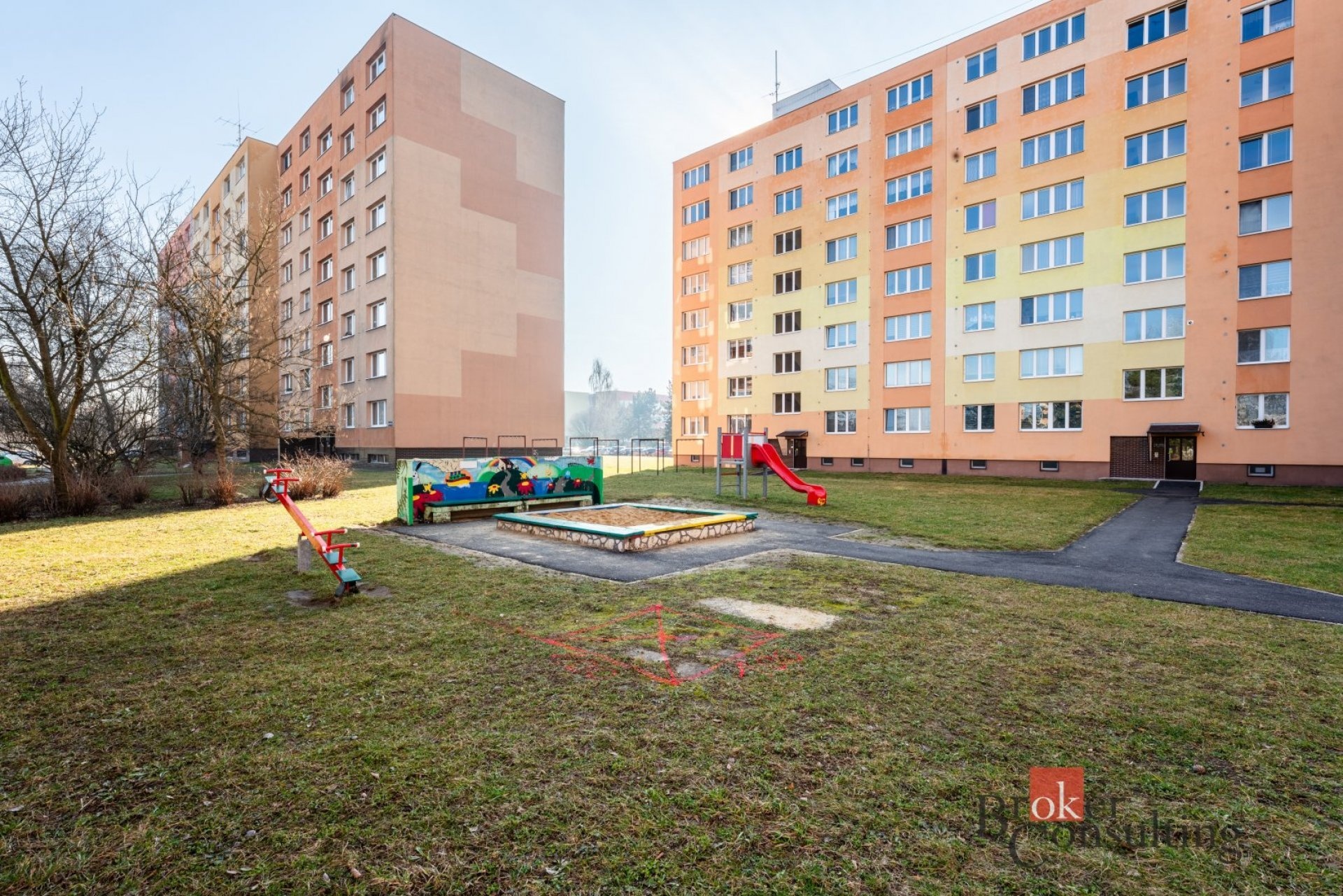 Dům se nachází na klidném sídlišti s dostatkem zeleně a kompletní občanskou vybaveností v docházkové vzdálenosti. Přímo u domu je k dispozici pískoviště a menší dětské hřiště, což ocení zejména rodiny s dětmi