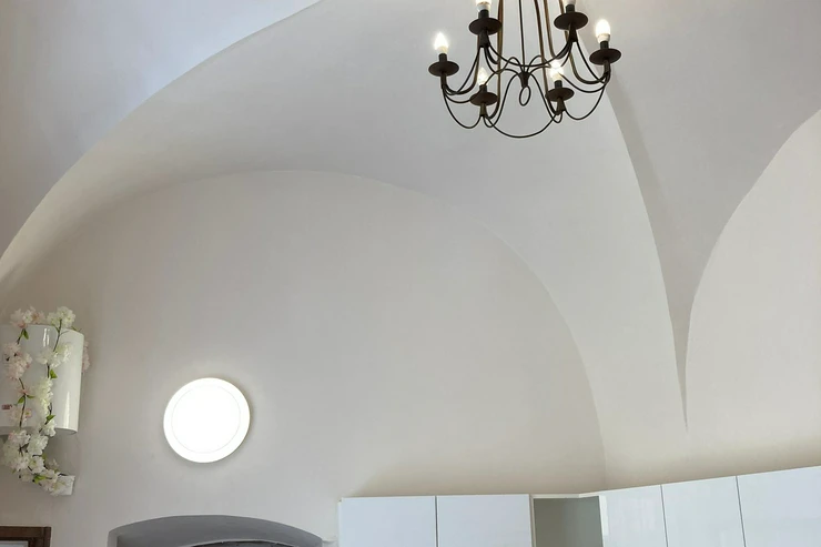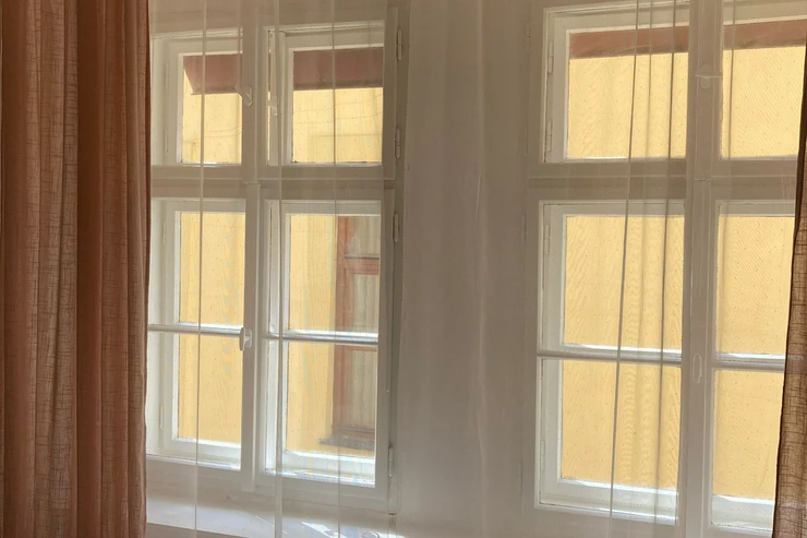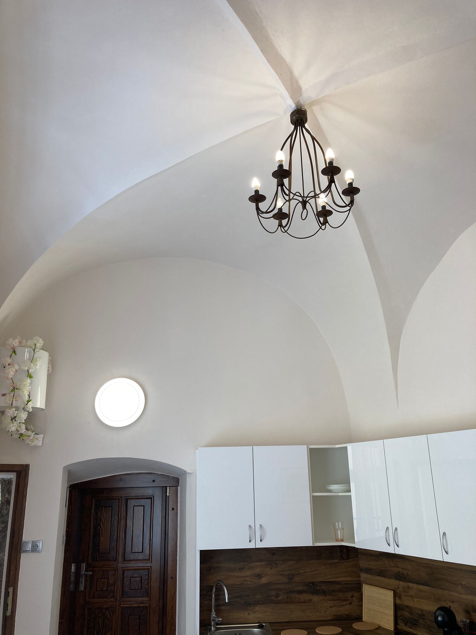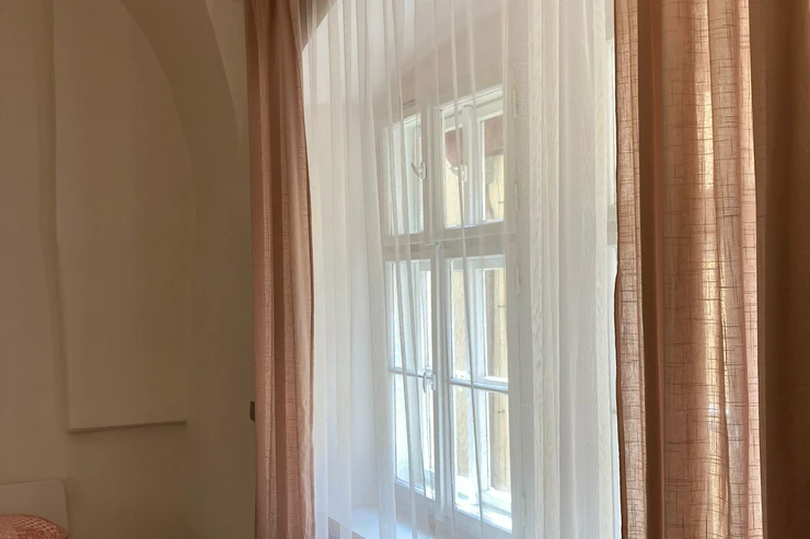 The apartment occupies the first floor of a historic building of Gothic origin, dating to the 13th and 14th century. High vaulted ceilings, large windows, and custom-made furnishings give the space a character that is rare at any price point. The layout is thoughtfully designed to make every square metre count, with generous built-in storage and a finish that requires no further investment.