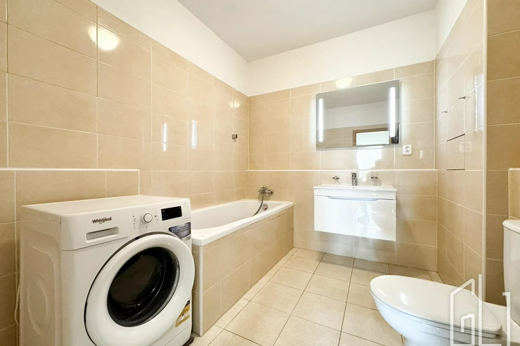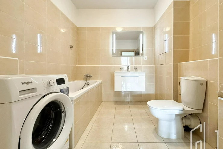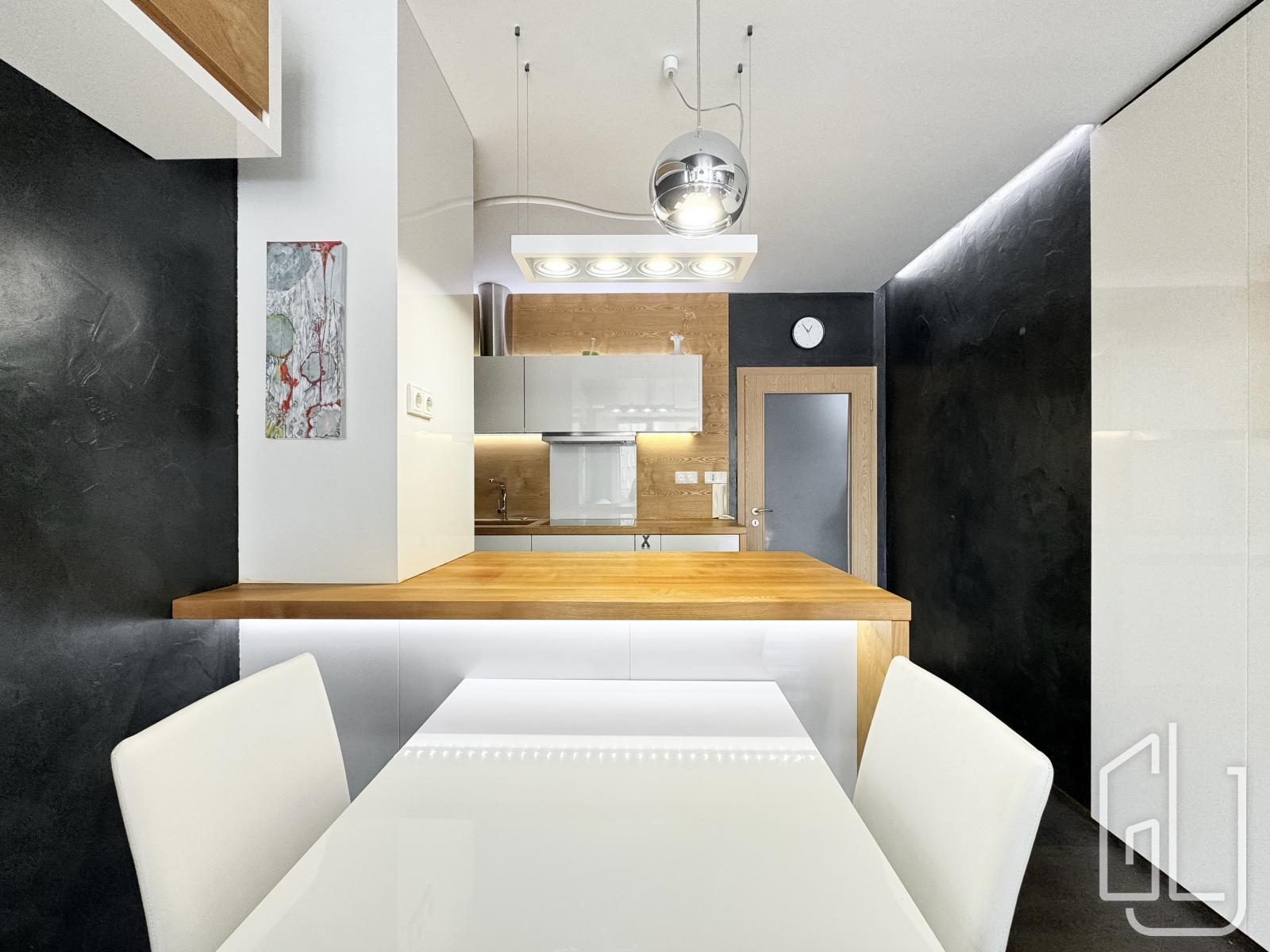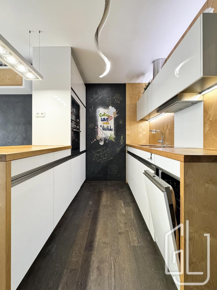 Dispozice bytu zahrnuje prostorný obývací pokoj s plně vybavenou kuchyňskou linkou, která disponuje vestavěnými spotřebiči včetně myčky nádobí. Obývací část je vzdušná a propojená s jídelním koutem.