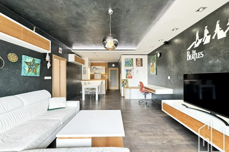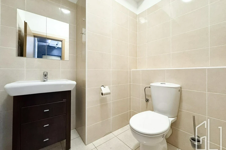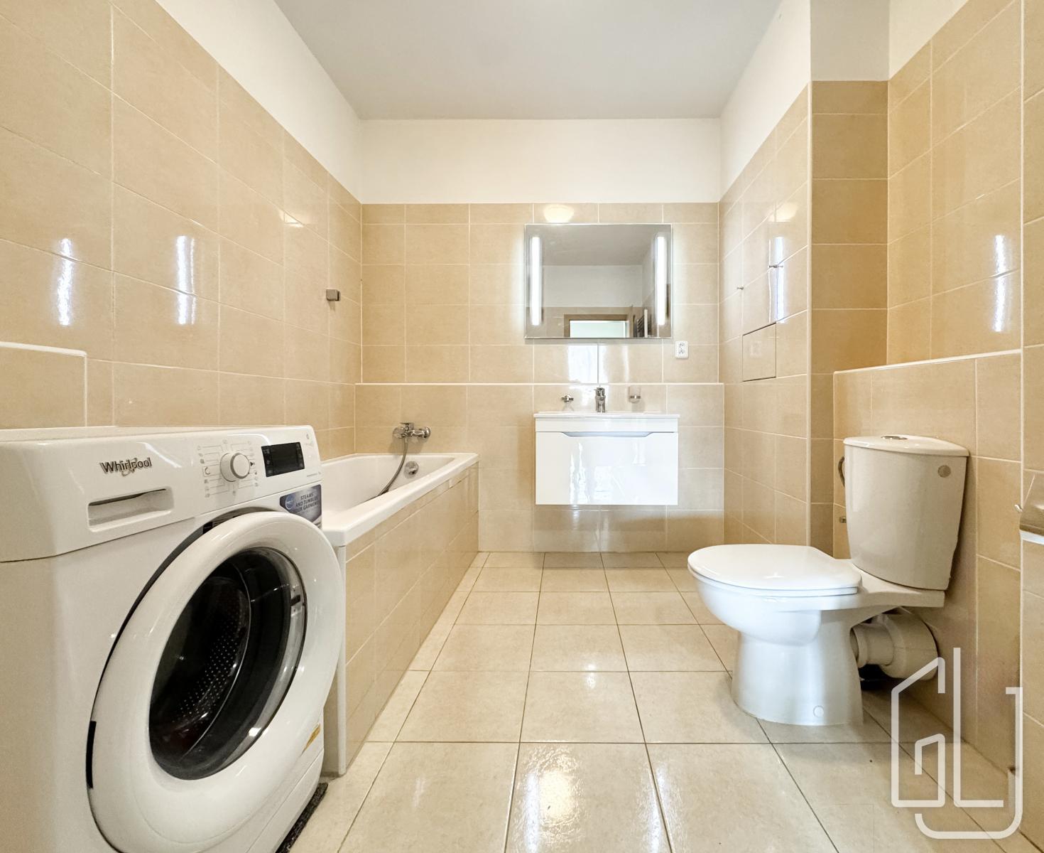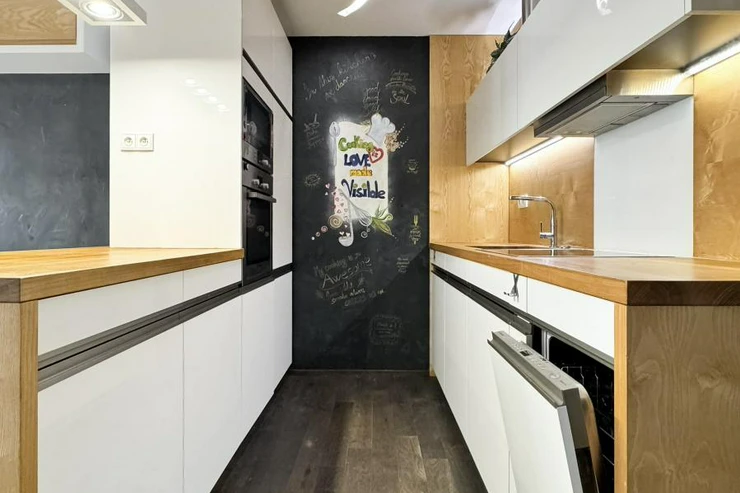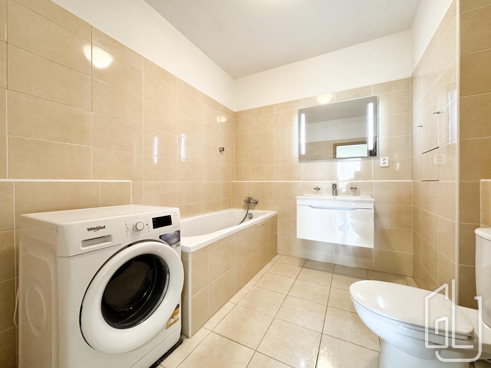 Dispozice bytu zahrnuje prostorný obývací pokoj s plně vybavenou kuchyňskou linkou, která disponuje vestavěnými spotřebiči včetně myčky nádobí. Obývací část je vzdušná a propojená s jídelním koutem.