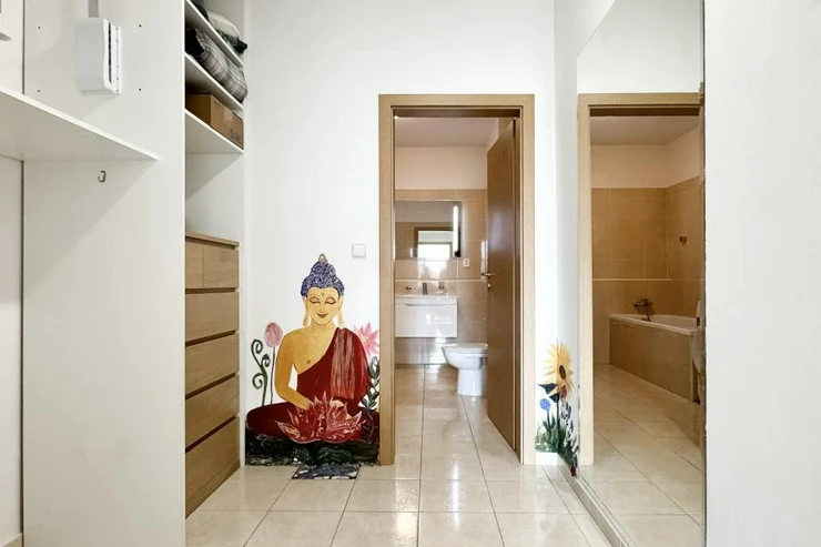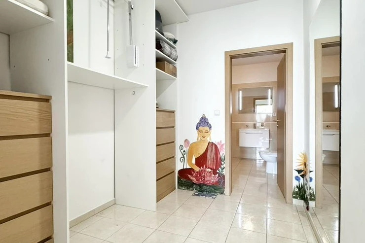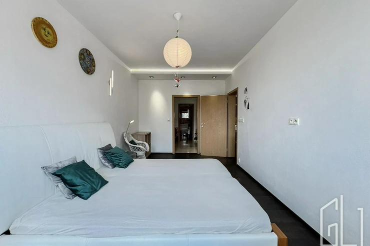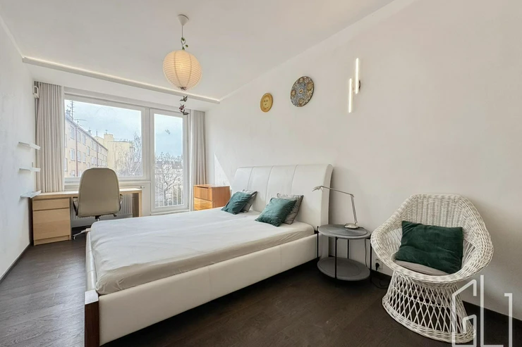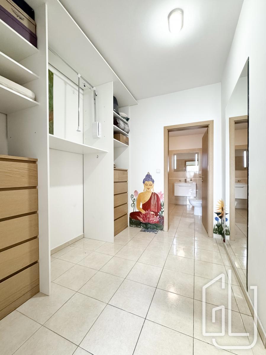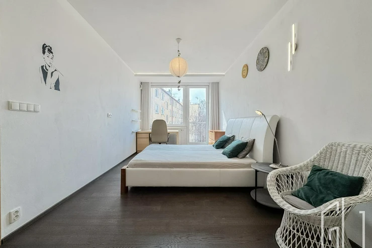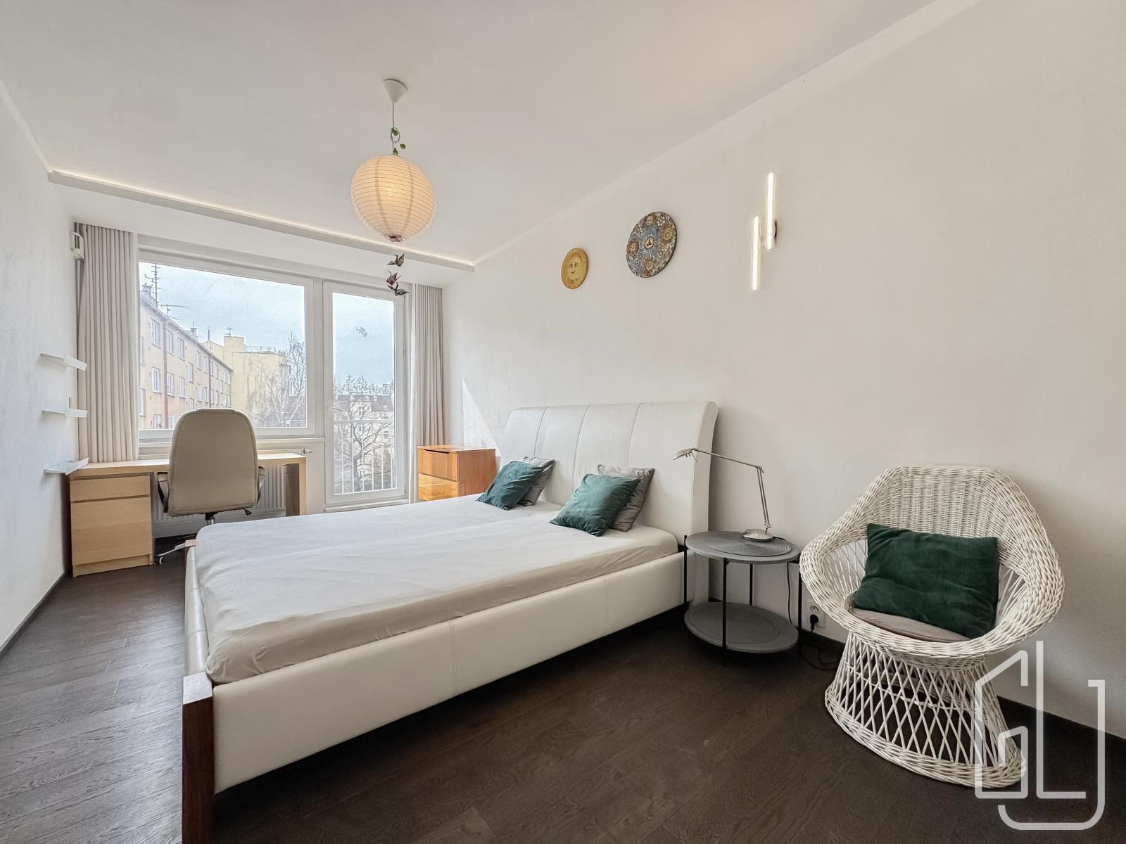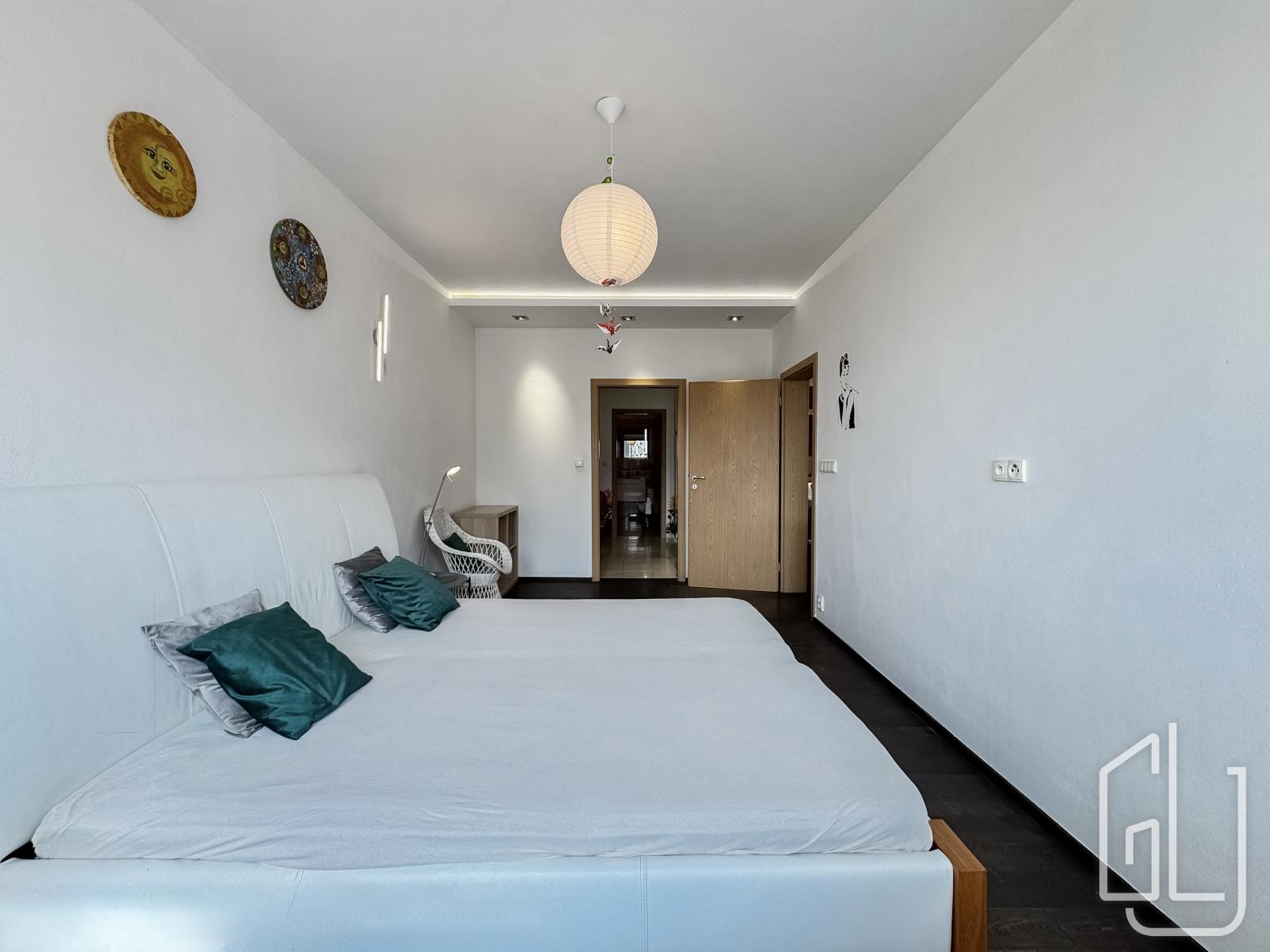Hlavní ložnice poskytuje dostatek prostoru a úložných možností. Velkou výhodou bytu je samostatná šatna, kterou lze využít také jako pracovnu nebo dětský pokoj, čímž byt prakticky odpovídá dispozici 3+kk.