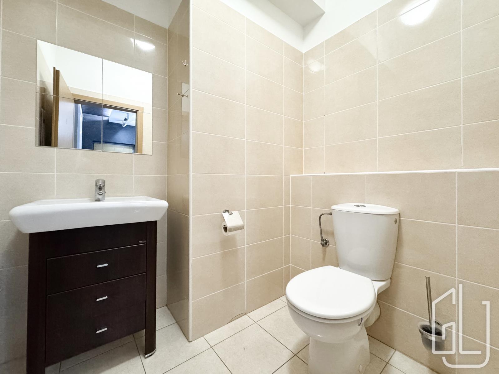 Koupelna je vybavena vanou, umyvadlem a toaletou. Další samostatná toaleta s umyvadlem zvyšuje komfort bydlení.