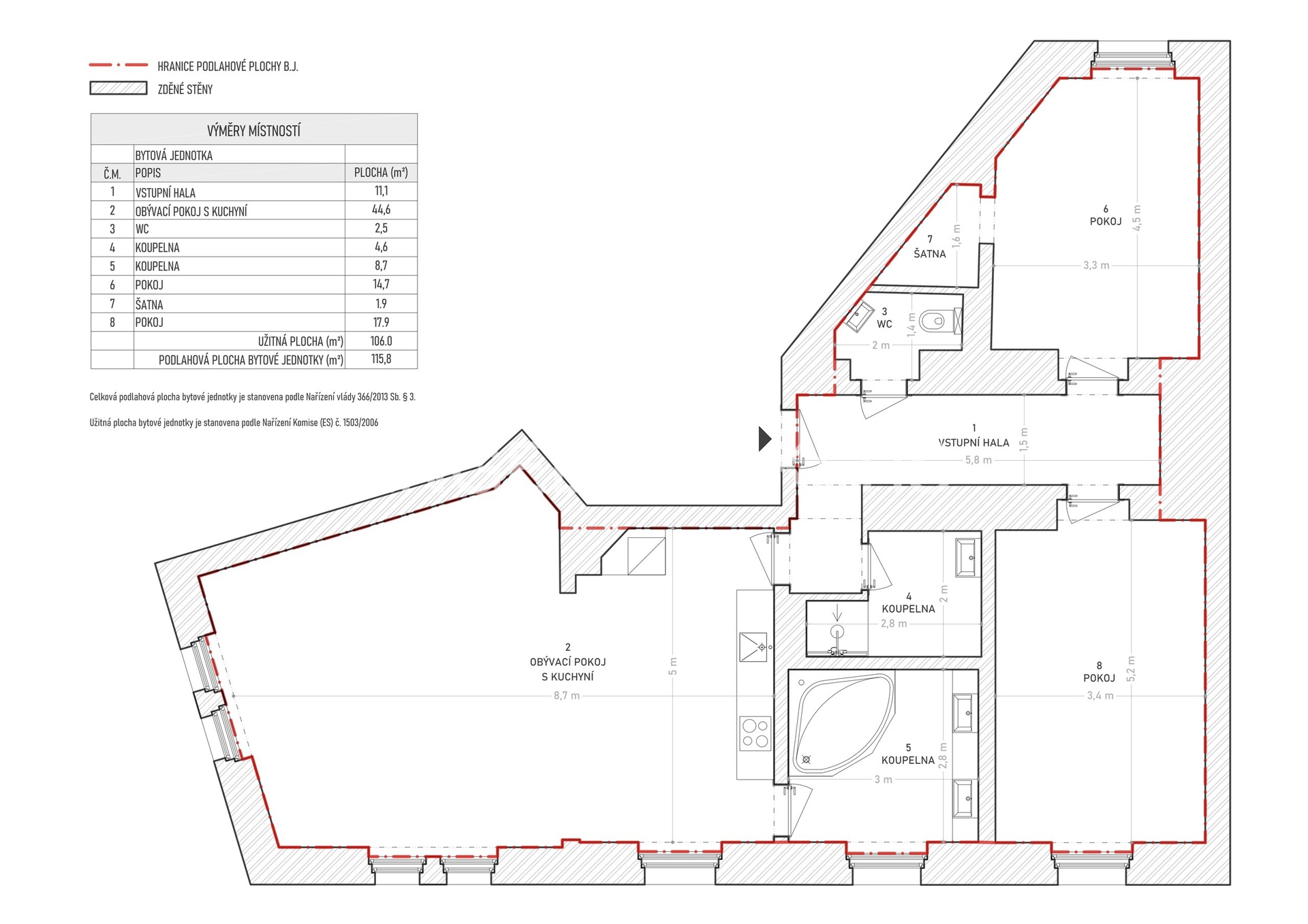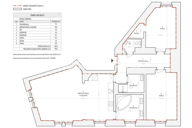 The apartment, with a generous usable area of 106 m² (116 m² of floor space), is currently designed as a 3+kt. Thanks to its spaciousness, it offers the possibility of layout modifications and the creation of comfortable family living with several bedrooms.