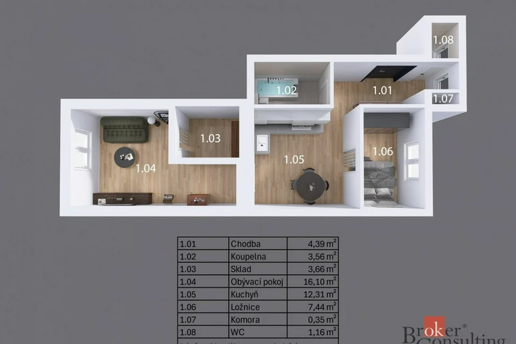 Byt nabízí prakticky řešenou dispozici se dvěma samostatnými pokoji, kuchyní, koupelnou a předsíní.