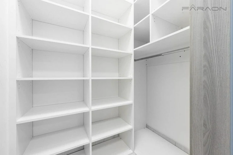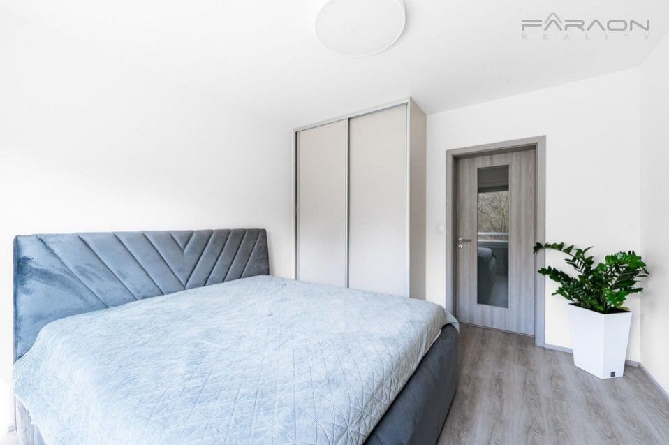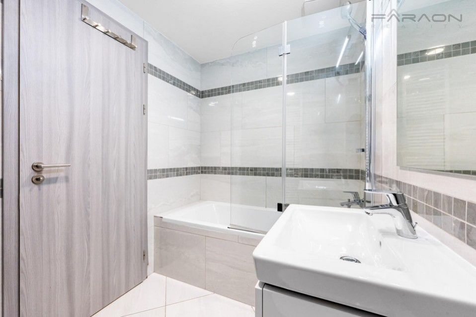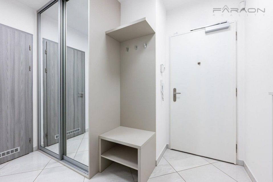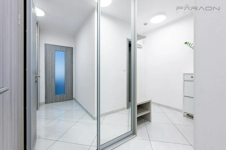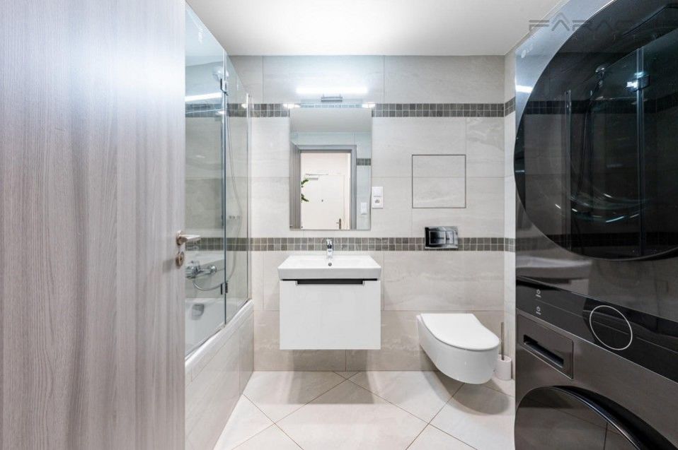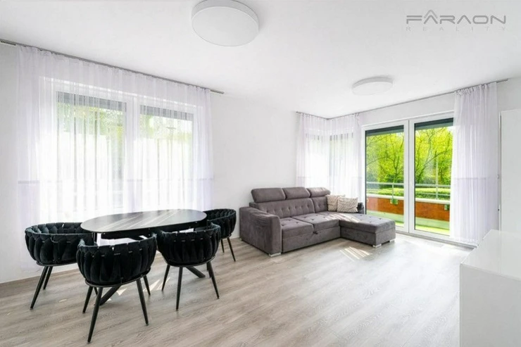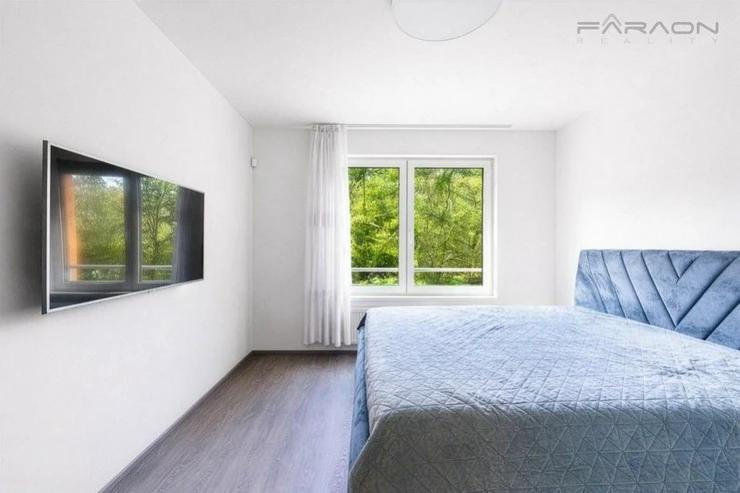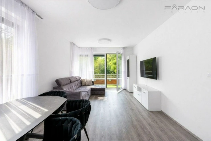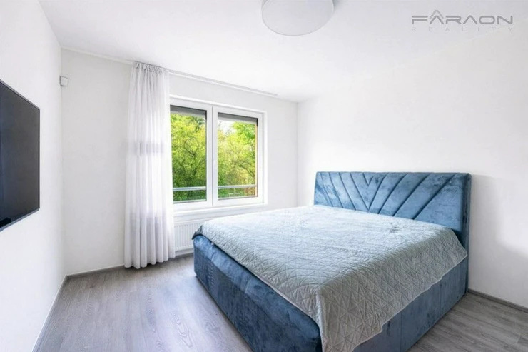 ComThe equipment includes a kitchen unit with built-in electrical appliances (induction hob, oven, dishwasher, extractor hood, fridge with freezer), a dining table with four designer chairs, a sofa bed, a TV cabinet with a TV, hot water underfloor heating in the bathroom, plastic windows with insulating triple glazing, electric-controlled front window external blinds, light wood vinyl flooring, tiles in the hallway and bathroom and a security entrance door with a security lock. The bedroom has a double bed and a wardrobe. The equipment also includes a washing machine and dryer.