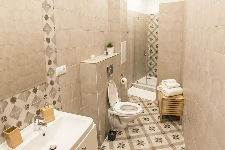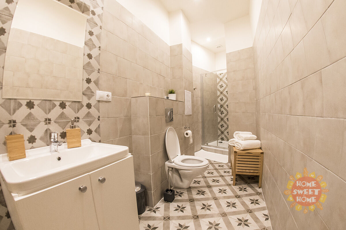 The apartment unit is divided into two separate apartments with an area of approximately 45 m², which are connected by soundproof double doors. Each apartment has its own bathroom with a toilet and a hallway with built-in wardrobes, providing ideal conditions for comfortable living. Historic alcoves with two double-glazed windows in each room ensure sufficient daylight.