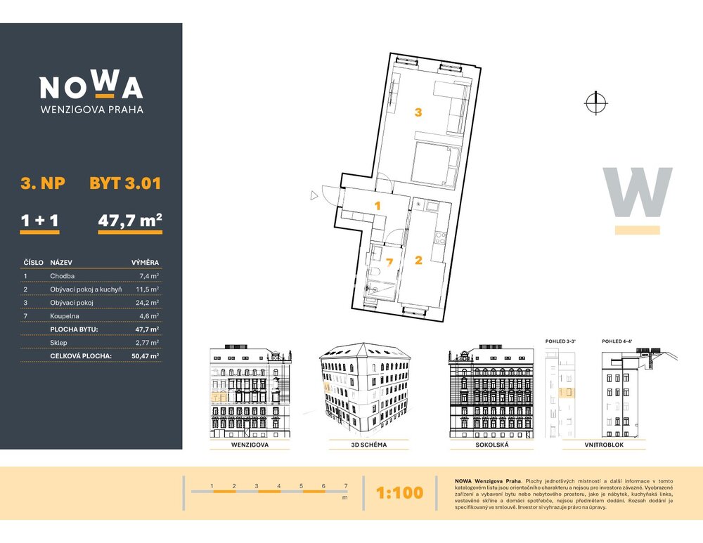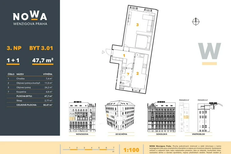 We are offering for sale a 1+1 apartment with a floor area of 47.7 sqm, located on the 3rd floor of the NOWA Wenzigova Prague project. The apartment offers a clear and functional layout of rooms, ensuring comfortable living in the wider city center.The dominant feature of the apartment is a spacious living room connected to a separate kitchen. The layout is complemented by a bathroom and an entrance hall with storage space. The apartment thus offers practical facilities suitable for individuals or couples.The unit also includes a 2.77 sqm storage unit, which provides additional practical storage space. It will be possible to rent a parking space directly in the building.The Nowa Wenzigova project is being built in the heart of the city, at the border between Prague’s Vinohrady and New Town districts. This historic Art Nouveau building, currently undergoing a sensitive renovation, will offer modern and functional living in the atmosphere of a traditional, vibrant urban neighborhood.All historical details, including the building’s facade, will be restored with respect for its historical character. The well-designed small-sized apartments will provide ample comfort and are a good choice for urban living, long-term investment, and rental. The elegant interiors of the common areas will be complemented by modern technical equipment. All to a high standard. For this purpose, future investors will appreciate the full range of amenities in the common areas of the building, including the entrance lobby and concierge. Wenzigova 4 is located in a premium part of Prague 2, on the border of New Town and Vinohrady, in a neighborhood with the typical atmosphere of wide, tree-lined streets, cafes, boutiques, and restaurants. Within walking distance, you’ll appreciate plenty of greenery and several parks — the popular Riegrovy Sady, Grebovka Park, and Folimanka Park offer space for relaxation and outdoor sports. Excellent transport accessibility, including public transit, ensures quick connections to the city center and other parts of the city. This location is among the most stable in Prague in terms of housing prices and rental demand.