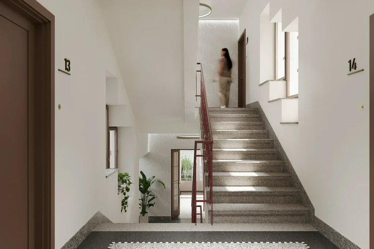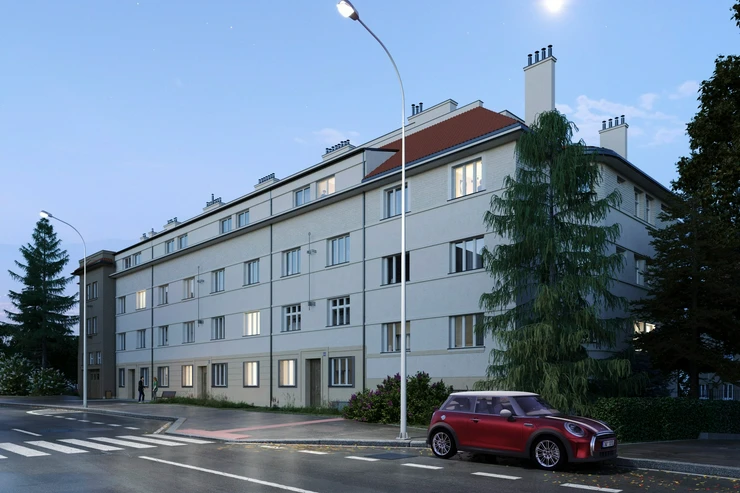 This one-bedroom apartment with a floor area of 62.90 m² is part of the Braník Living residential project, which is being created by the careful reconstruction of three brick buildings from the 1930s. It is located on Ke Krči - a quiet street in the vicinity of the Braník Rocks and the cycle path along the Vltava River. It is just a few minutes on foot from public transport stops.