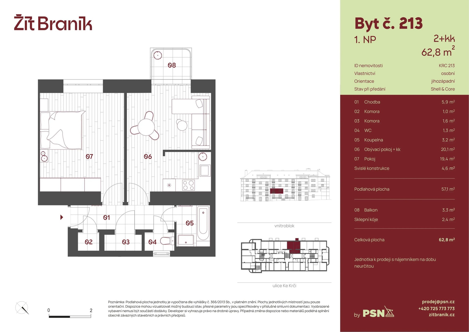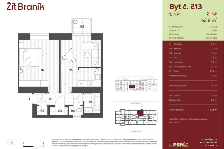 This one-bedroom apartment with a floor area of 57.10 m² is part of the Braník Living residential project, which is being created by the careful reconstruction of three brick buildings from the 1930s. It is located on Ke Krči - a quiet street in the vicinity of the Braník Rocks and the cycle path along the Vltava River. It is just a few minutes on foot from public transport stops.