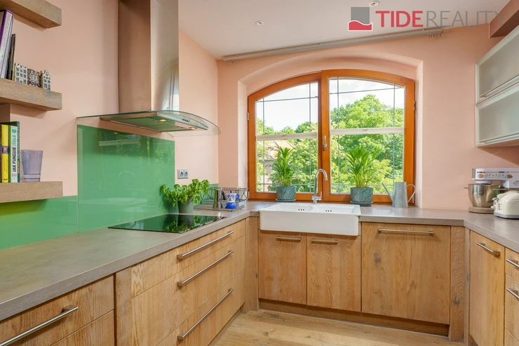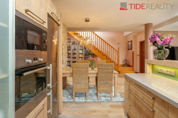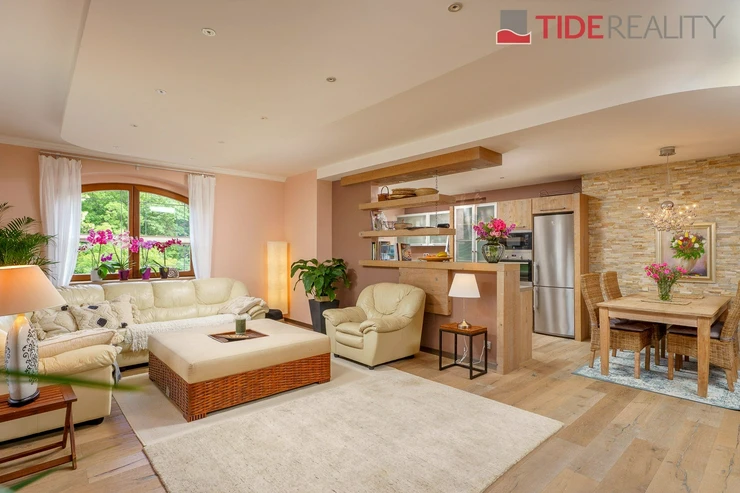 Poloha v nejvyšším patře zaručuje majitelům soukromí, terasa s rozlehlou zimní zahradou kontakt s okolní zelení. Otevřený obytný prostor o ploše 66 m2 je velmi dobře funkčně členěný na kuchyň, jídelní prostor a obytnou část.