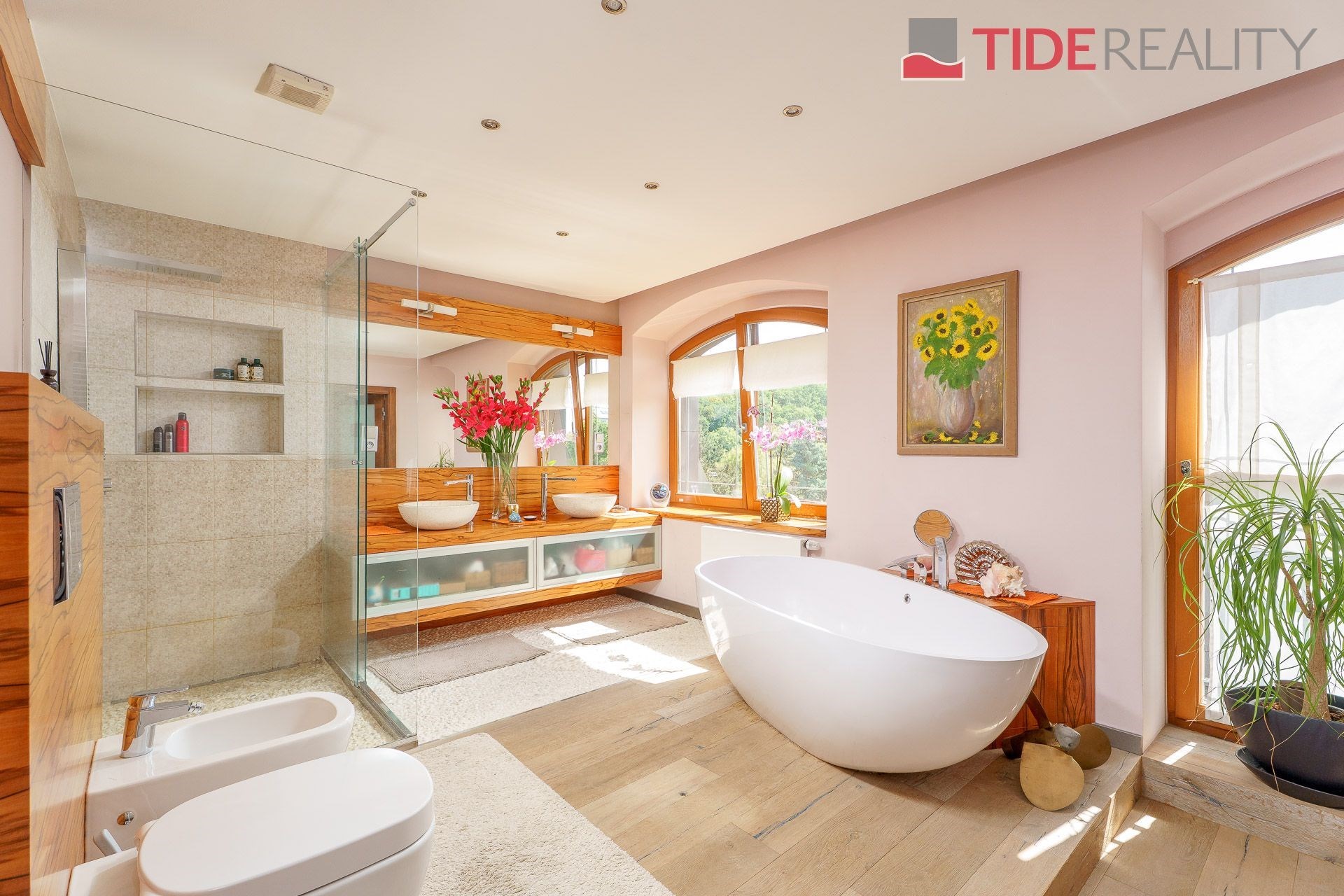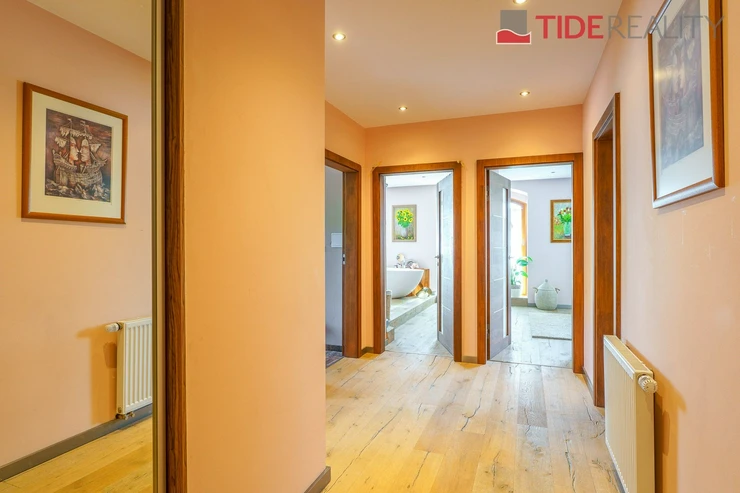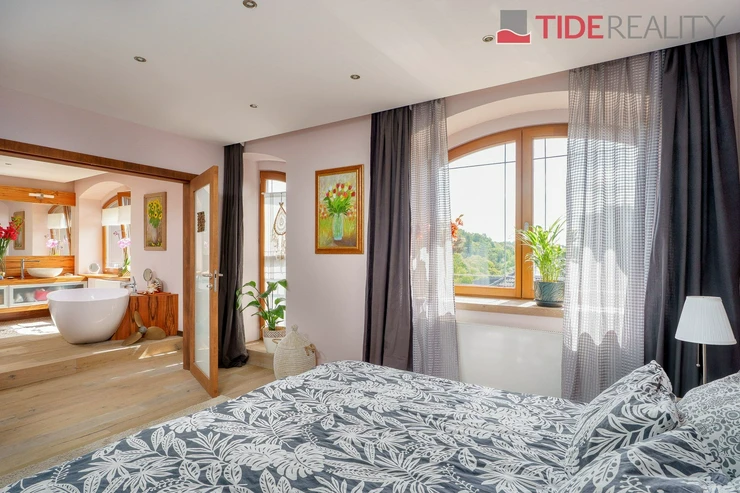 Manželská ložnice (17,6 m2) je přímo propojena s koupelnou o ploše 14 m2, která vytváří privátní wellness zázemí. Další dva pokoje využívají druhou koupelnu.