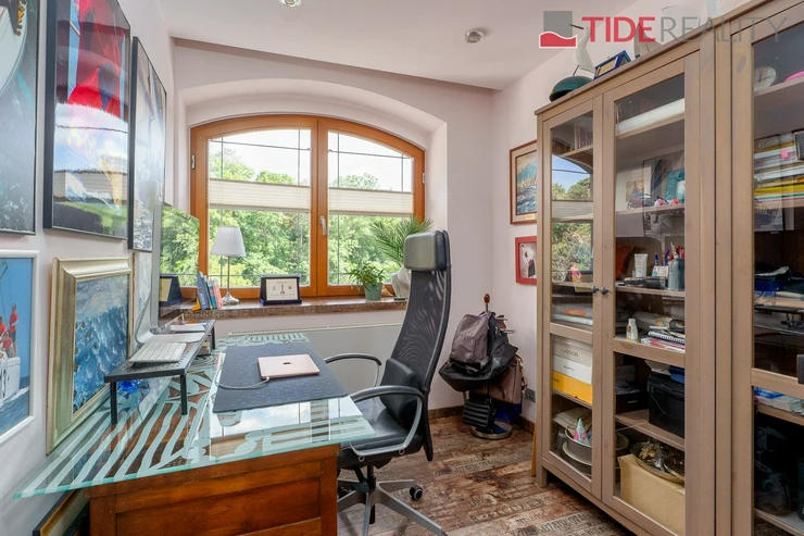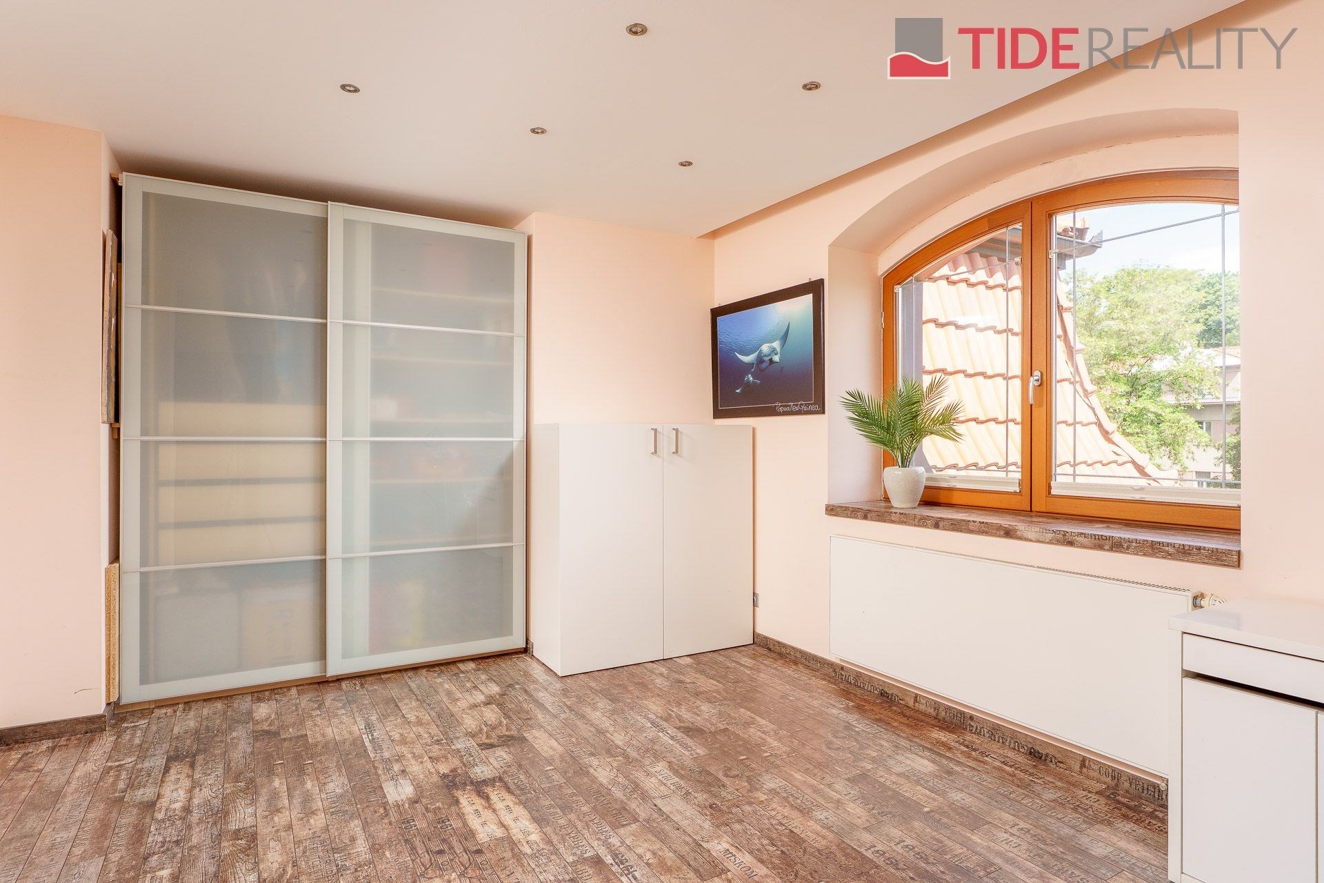 Byt má dostatek úložných prostor: dvě komory přímo v bytě a dvě sklepní místnosti v suterénu domu, kde je i garáž pro majitele bytových jednotek. Spolu s bytem je prodáváno jedno garážové stání, u domu je klidná ulice s parkovacími místy. Dům má výtah propojující všechny podlaží.