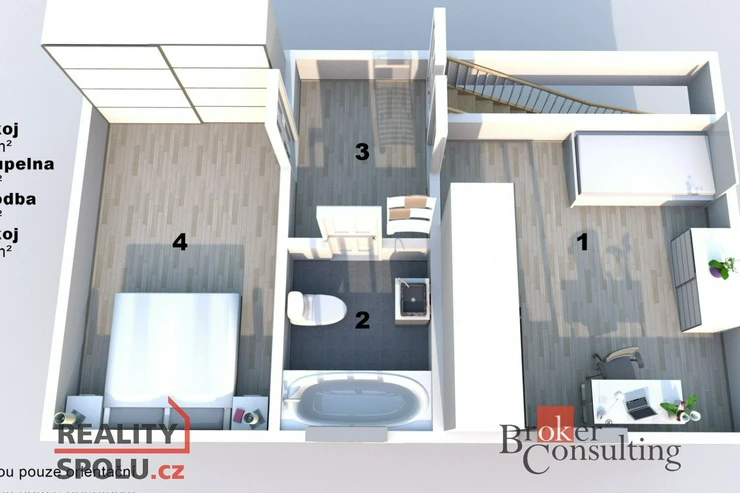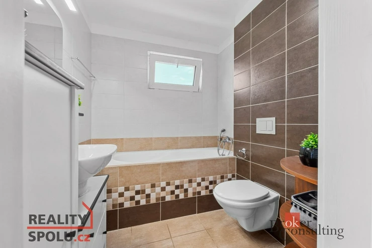 V patře jsou dva pokoje, druhá koupelna a přístup do půdního prostoru, který slouží jako praktický úložný prostor.